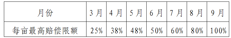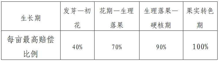 赔偿标准:根据梨、葡萄的不同生长期,按保额的一定比例确定当时的最高赔偿标准,按照发生损失时的最高赔偿标准、损失率及受损面积计算赔偿(见下表)。