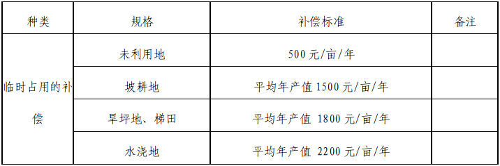 注∶临时占地手续由建设单位到县自然资源局办理临时用地手续,并缴纳复垦保证金。土地类别应以自然资源局图库为准,复垦保证金只针对耕地,占用其它用地的,施工完毕后按原使用性质整平恢复,不再交纳复垦保证金。缴纳标准为∶