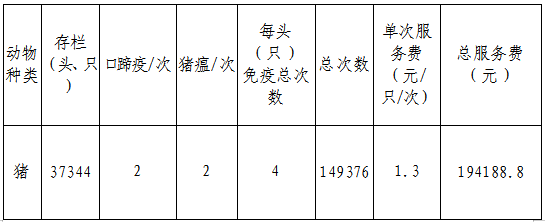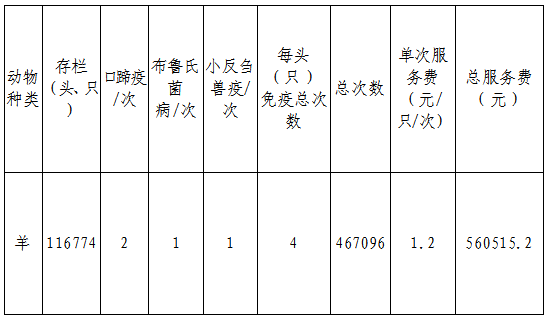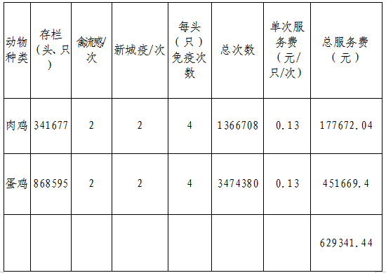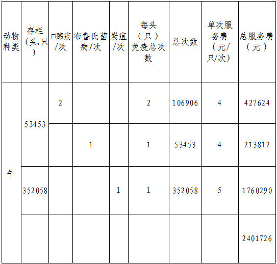 经测算,2024年动物防疫社会化服务资金约416.577144万元(服务费用不包含疫苗费用),具体费用如下: