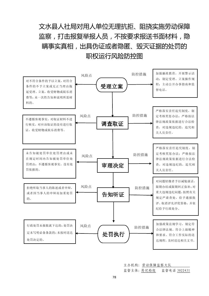 1.立案责任:符合条件的予以立案,对材料不全的,一次性告知所需材料。 2.调查责任:遵循客观事实,对应该取证的进行取证。 3.审查责任:对取证材料进行认真审查核实,需补充取证的及时补证。 4.告知责任:在规定时间内告知被处罚单位处罚理由。作出行政处罚决定前,应制作《行政处罚听证告知书》送达当事人,告知违法事实及其享有的陈述、申辩等权利。 5.决定责任:作出行政处罚决定应严格审查。制作行政处罚决定书,应载明必备内容。 6.送达责任:行政处罚决定书按法律规定的方式送达当事人。 7.执行责任:依照生效的行政处罚决定采取执行措施。 8.其他:法律法规规章规定应履行的责任。 |