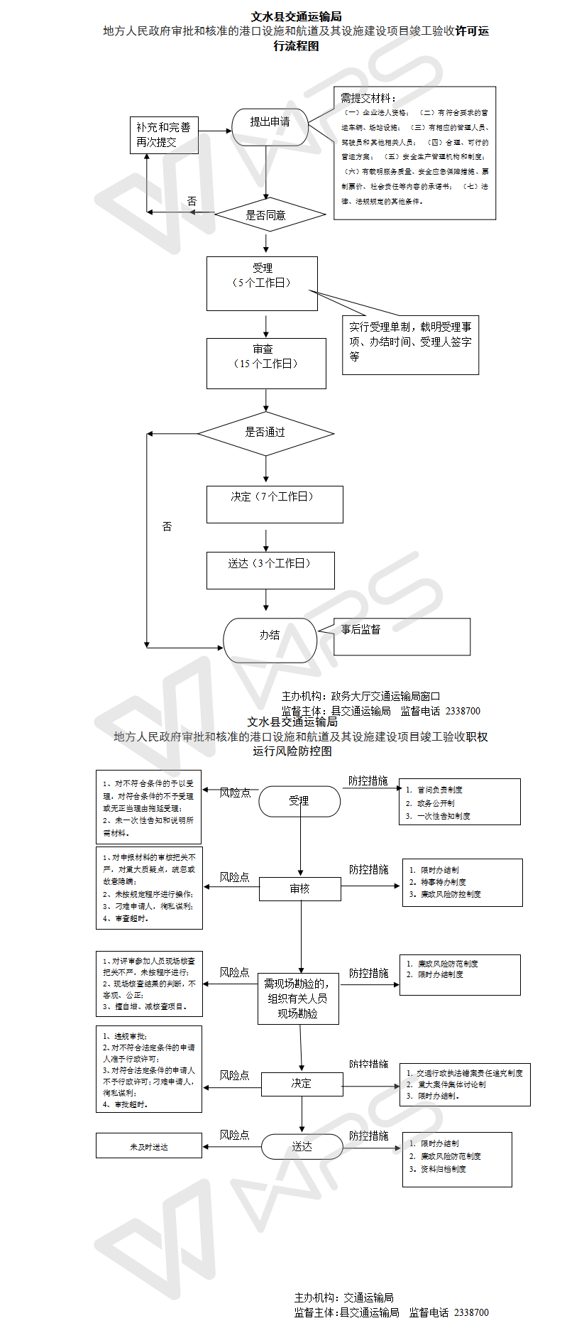 行 政 许 可 | 40745053-X-XK-0021 | 地方人民政府审批和核准的港口设施和航道及其设施建设项目竣工验收 | 《中华人民共和国港口法》《中华人民共和国航道管理条例》(国务院令第545号) | 1.立案阶段:行政处罚机关检查或者接到举报等,发现法违法情形的,并决定是否立案。2.调查取证阶段:对立案的案件,指定专人负责,执法人员不得少于两人,调查时出示执法证,对发现的问题应当作出书面记录,并由监督检查人员和被检查对象签字或盖章。收集证据时,可以采取抽样取证的方法。在证据可能灭失或者以后难以取得的情况下,经行政机关负责人批准,可以先行登记保存。3.审查阶段:调查终结,行政机关负责人应当对调查结果审查4.告知阶段:书面报告当事人违法事实及其享有的陈述、申辩、要求听证等权力。5.决定阶段:决定给予被检查对象行政处罚的,应当制作行政处罚决定书,并载明违法事实和证据、处罚依据和内容、申请行政复议或提起行政诉讼的途径和期限等内容。6.送达阶段:行政处罚决定书应当在宣告后当场交付当事人。当事人不在场的,7日内将行政处罚决定书送达当事人。7.执行阶段:监督检查行政处罚的执行情况,行政处罚决定履行后,应当制作《行政处罚结案报告》。8.其他法律法规规章文件规定应履行的责任。 | 因不履行或不正确履行行政职责,有下列情形的,行政机关及相关工作人员应承担相应的责任:1.没有法律或者事实依据实施行政处罚的;2.未按法定程序实施行政处罚的;3.指派不具备行政执法资格的人员实施行政处罚的;4.擅自设立处罚种类或者改变处罚幅度、范围的;5.违反“罚缴分离”规定,擅自收取罚款的;6.对当事人进行罚款、没收财物等行政处罚不使用法定单据的;7.应当依法举行听证而未举行听证或者应当履行法定告知义务而未履行的;8.玩忽职守,对违法行为不予制止、处罚,致使公民、法人或其他组织的合法权益、公共利益和社会秩序遭受损害的;9.徇私舞弊、包庇纵容违法行为的;10.在行政处罚过程中发生腐败行为的;11.其他违反法律法规规章文件规定的行为。 | 《中华人民共和国港口法》第二十三条取得港口经营许可,应当有固定的经营场所,有与经营业务相适应的设施、设备、专业技术人员和管理人员,并应当具备法律、法规规定的其他条件。 《中华人民共和国航道管理条例》(国务院令第545号) 第二十七条 对违反本条例规定的单位和个人,县以上交通主管部门可以视情节轻重给予警告、罚款的处罚。 第二十八条 当事人对交通主管部门的处罚不服的,可以向上级交通主管部门提出申诉;对上级交通主管部门的处理不服的,可以在接到处理决定书之日起15日内向人民法院起诉。逾期不起诉又不履行的,交通主管部门可以申请人民法院强制执行。 | 一、行政处理 1、诫勉谈话或者责令书面检讨;2、通报批评;3、暂扣行政执法证件;4、责令离岗培训;5、调离执法岗位6、取消执法资格;7、依法追偿部分或者全部行政赔偿费用。二、行政处分:警告、记过、记大过、降级、撤职、开除。三、党纪处分:警告、严重警告、撤销党内职务、留党察看、开除党籍。 四、其他法律责任 | |