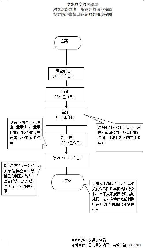 行政处罚 | 40745053-X-CF-0178 | 对客运经营者、货运经营者不按照规定携带车辆营运证的处罚 | 【行政法规】《中华人民共和国道路运输条例》(国务院令第666号第二次修订)第六十八条 | 1.立案责任:通过群众举报、上级部门交办、其他机关移送、新闻媒体披露、行政机关履行对运输企业监督检查职能等途径,发现客运经营者、货运经营者不按照规定携带车辆营运证的违法行为,予以审查,执法人员初步调查后,认为有证据证明违法事实成立,报负责人审核,负责人对违法事实、主要证据、法律法规等依据审核后作出立案或不予立案的决定,将不予立案的理由告知相关人员并作书面记录。 2.调查责任:对立案的案件,指定案件承办人,及时组织调查取证,与当事人有直接利害关系的应当回避。执法人员不得少于2人,调查时应出示执法证件,听取当事人辩解陈述并做记录。执法人员应保守有关秘密。 3.审查责任:审查案件调查报告,对案件违法事实、证据、调查取证程序、法律适用、处罚种类和幅度、当事人陈述和申辩理由等方面进行审查,提出处理意见(主要证据不足时,以适当方式补充调查)。 4.告知责任:作出行政处罚决定前,应制作《违法行为通知书》送达当事人,告知违法事实及其享有的陈述、申辩以及听证等权利。符合听证条件且当事人要求听证的,应当举行听证会,制作并送达《行政处罚听证告知书》,作出重大行政处罚的,依照相关规定进行集体讨论,作出具体处罚内容的决策。 5.决定责任:制作行政处罚决定书,载明行政处罚的种类和依据、当事人陈述申辩或者听证情况等内容,作出重大行政处罚的,应载明集体讨论事实、理由、依据。 6.送达责任:按照法律规定的方式送达当事人法律文书。 7.执行责任:依照生效的行政处罚决定,执行责令改正、没收违法所得、罚款等处罚项目。 8.其他法律法规规章规定应履行的责任。 | 1、没有法律和事实依据实施行政处罚的; 2、行政处罚显失公正的; 3、执法人员玩忽职守,对应当予以制止和处罚的违法行为不予制止、处罚,致使公民、法人或者其他组织的合法权益、公共利益和社会秩序遭受损害的; 4、不具备行政执法资格实施行政处罚的; 5、擅自改变行政处罚种类、幅度的; 6、违反法定的行政处罚程序的; 7、违反“罚缴分离”规定,擅自收取罚款的; 8、不使用罚款单据或使用非法定部门制发的罚款单据的;11、截留、私分或À相私分罚款的; 10、符合听证条件、行政管理相对人要求听证,应予组织听证而不组织听证的; 11、在行政处罚过程中发生腐败行为的; 12、其他违反法律法规规章规定的行为。 | 【行政法规】《中华人民共和国道路运输条例》(国务院令第666号第二次修订)第六十八条 第六十八条 违反本条例的规定,客运经营者、货运经营者不按照规定携带车辆营运证的,由县级以上道路运输管理机构责令改正,处警告或者20元以上200元以下的罚款。 | 一、行政处理 1、诫勉谈话或者责令书面检讨;2、通报批评;3、暂扣行政执法证件;4、责令离岗培训;5、调离执法岗位6、取消执法资格;7、依法追偿部分或者全部行政赔偿费用。二、行政处分:警告、记过、记大过、降级、撤职、开除。三、党纪处分:警告、严重警告、撤销党内职务、留党察看、开除党籍。 四、其他法律责任 |