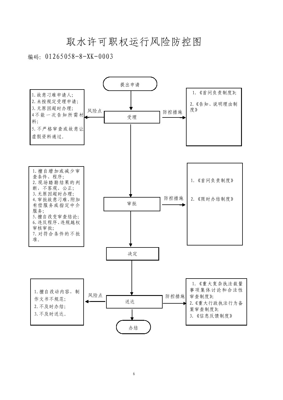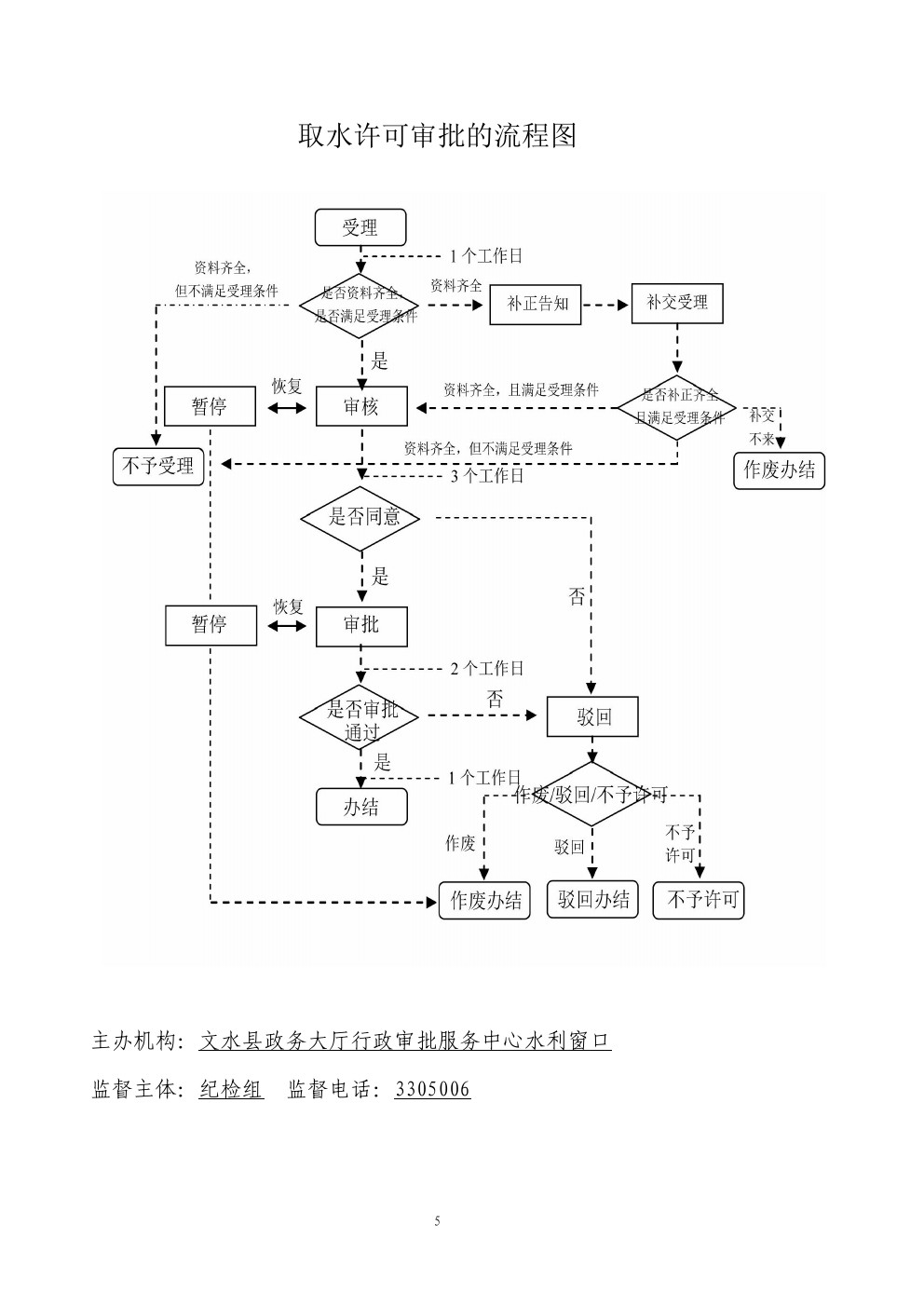 1、受理责任:公示取水许可审批应当提交的材料,一次性告知补正材料,依法受理或不予受理,不予受理的应当书面告知。 2、审查责任:对照取水许可审批条件和标准,对书面申请材料进行审核,组织现场考察。 3、决定责任:作出取水许可审批行政许可或者不予行政许可决定,不予许可的应当书面告知。 4、送达责任:准予许可的,制发许可证书或批件,送达并信息公开。 5、事后监管责任:建立实施监督检查的运行机制和管理制度,开展定期和不定期检查,依法采取相关处置措施。 6.其他责任:法律法规规章规定应履行的责任。 |