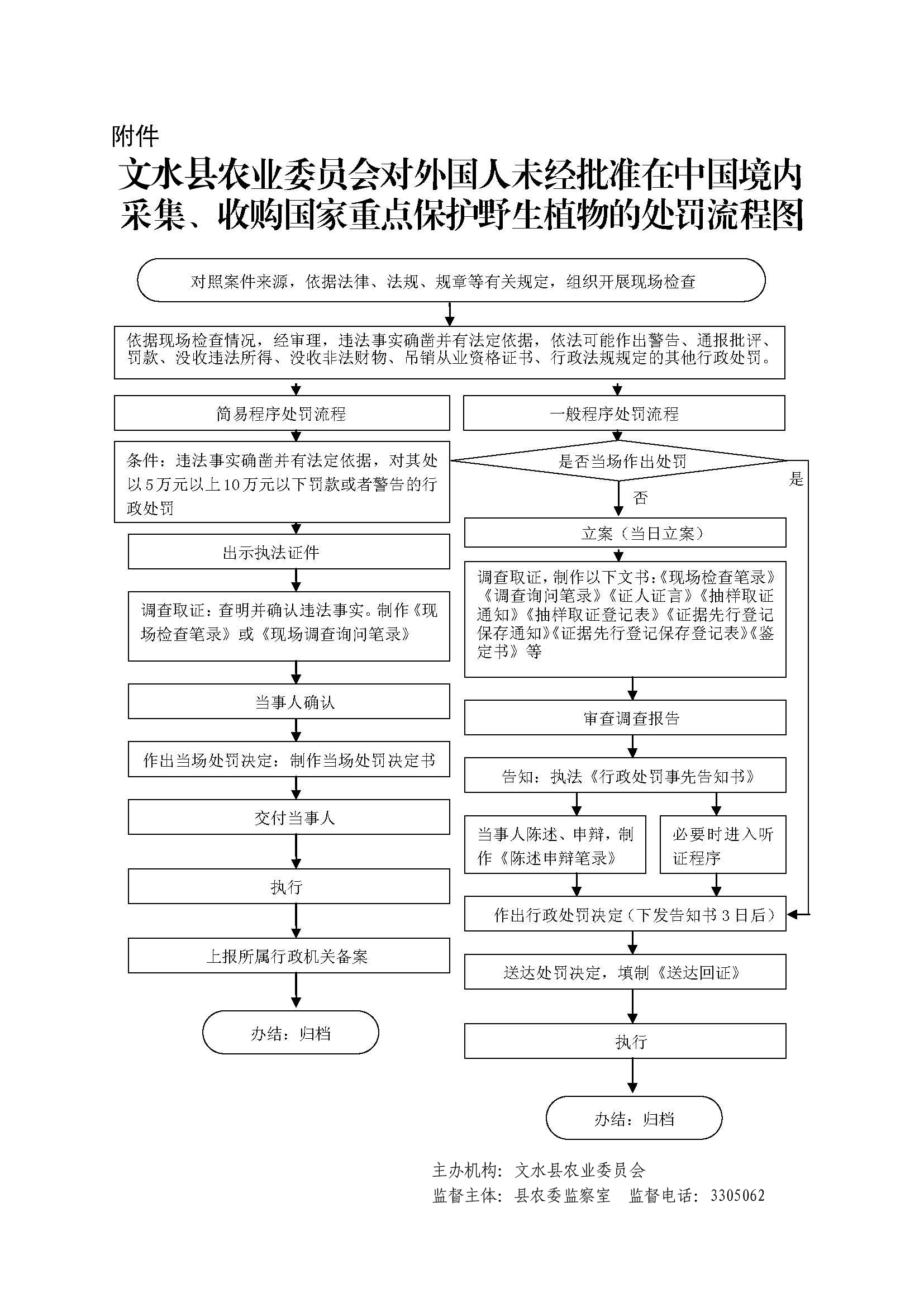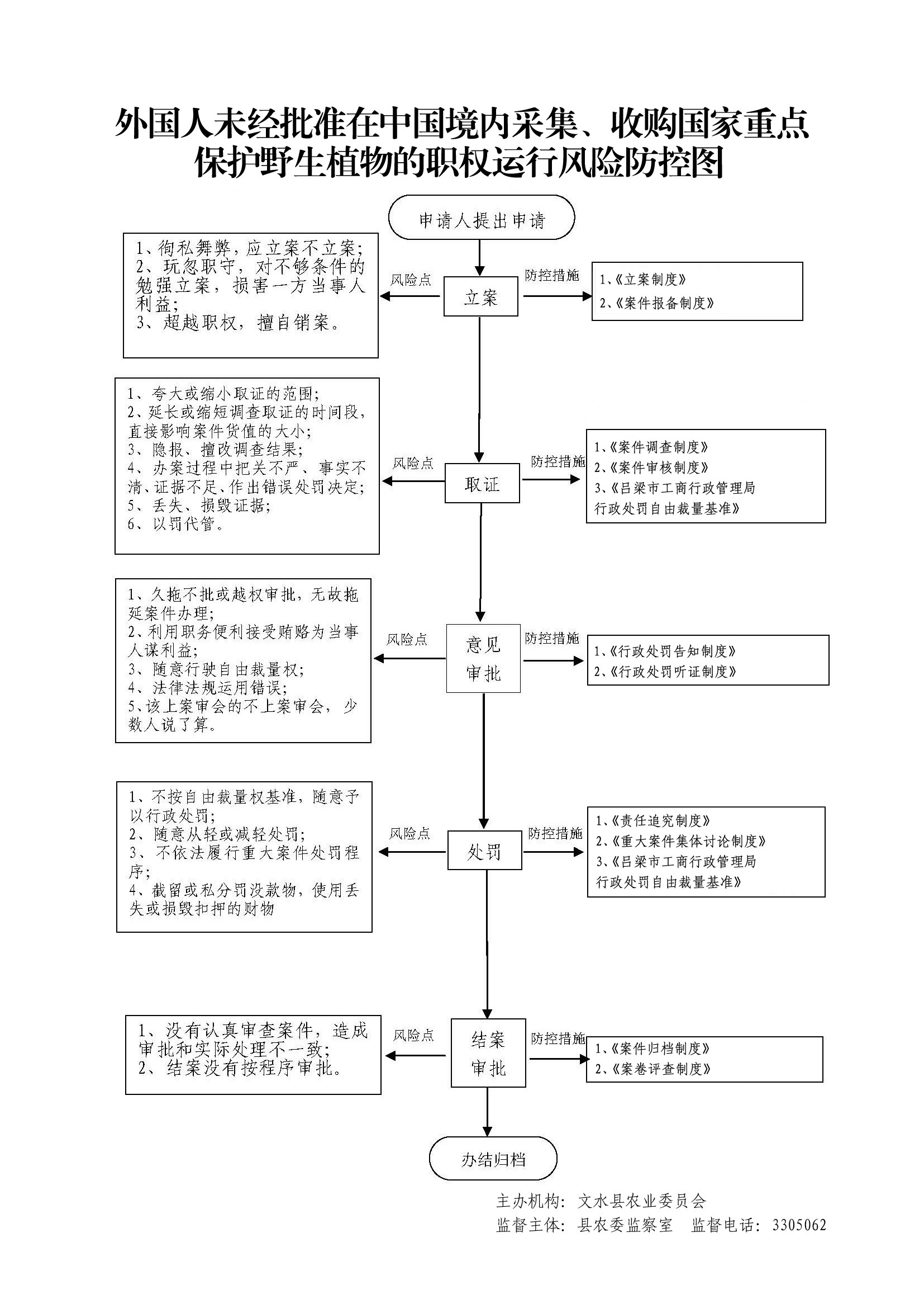1、立案责任:发现外国人未经批准在中国境内采集、收购国家重点保护野生植物的行为,予以审查、决定是否立案。2、调查责任:农业执法大队对立案的案件,指定专人负责,及时组织调查取证,与当事人有直接利害关系的应到回避。执法人员不得少于两人,调查时应出示执法证件,允许当事人辩解陈述。执法人员应保守有关秘密。3、审查责任:审理案件调查报告,对案件违法事实、证据、调查取证程序、法律适用、处罚种类和幅度、当事人陈述和身边理由等方面进行审查,提出处理意见(主要证据不足时,以适当的方式补充调查)。4、告知责任:作出行政处罚决定前,应制作《行政处罚告知书》送达当事人,告知违法事实及其享有的 陈述、申辩等权利。符合听证规定的,制作并送达《行政处罚听证告知书》。5、决定责任:制作行政处罚决定书,载明行政处罚告知、当事人陈述申辩或者听证情况等内容。6、送达责任:行政处罚决定书按法律规定的方式送达当事人7、执行责任:依照生效的行政处罚决定,进行处罚。8、其他法律法规规章文件规定应履行的责任。 |