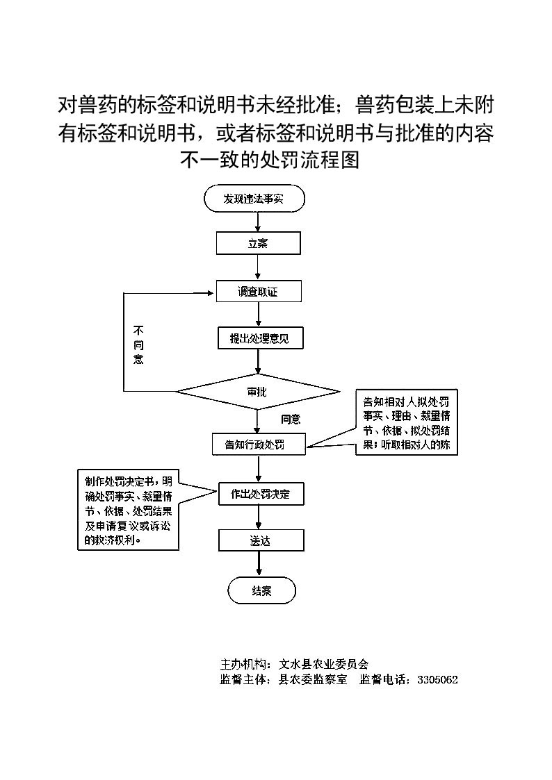 1、立案责任:发现兽药的标签和说明书未经批准的违法行为,予以审查、决定是否立案。 2、调查责任: 对立案的案件,指定专人负责,及时组织调查取证,与当事人有直接利害关系的应到回避。执法人员不得少于两人,调查时应出示执法证件,允许当事人辩解陈述。执法人员应保守有关秘密。 3、审查责任:审理案件调查报告,对案件违法事实、证据、调查取证程序、法律适用、处罚种类和幅度、当事人陈述和身边理由等方面进行审查,提出处理意见(主要证据不足时,以适当的方式补充调查)。 4、告知责任:作出行政处罚决定前,应制作《行政处罚告知书》送达当事人,告知违法事实及其享有的陈述、申辩等权利。符合听证规定的,制作并送达《行政处罚听证告知书》。 5、决定责任:制作行政处罚决定书,载明行政处罚告知、当事人陈述申辩或者听证情况等内容。 6、送达责任:行政处罚决定书按法律规定的方式送达当事人 7、执行责任:依照生效的行政处罚决定,进行处罚。 8、其他法律法规规章文件规定应履行的责任。 |