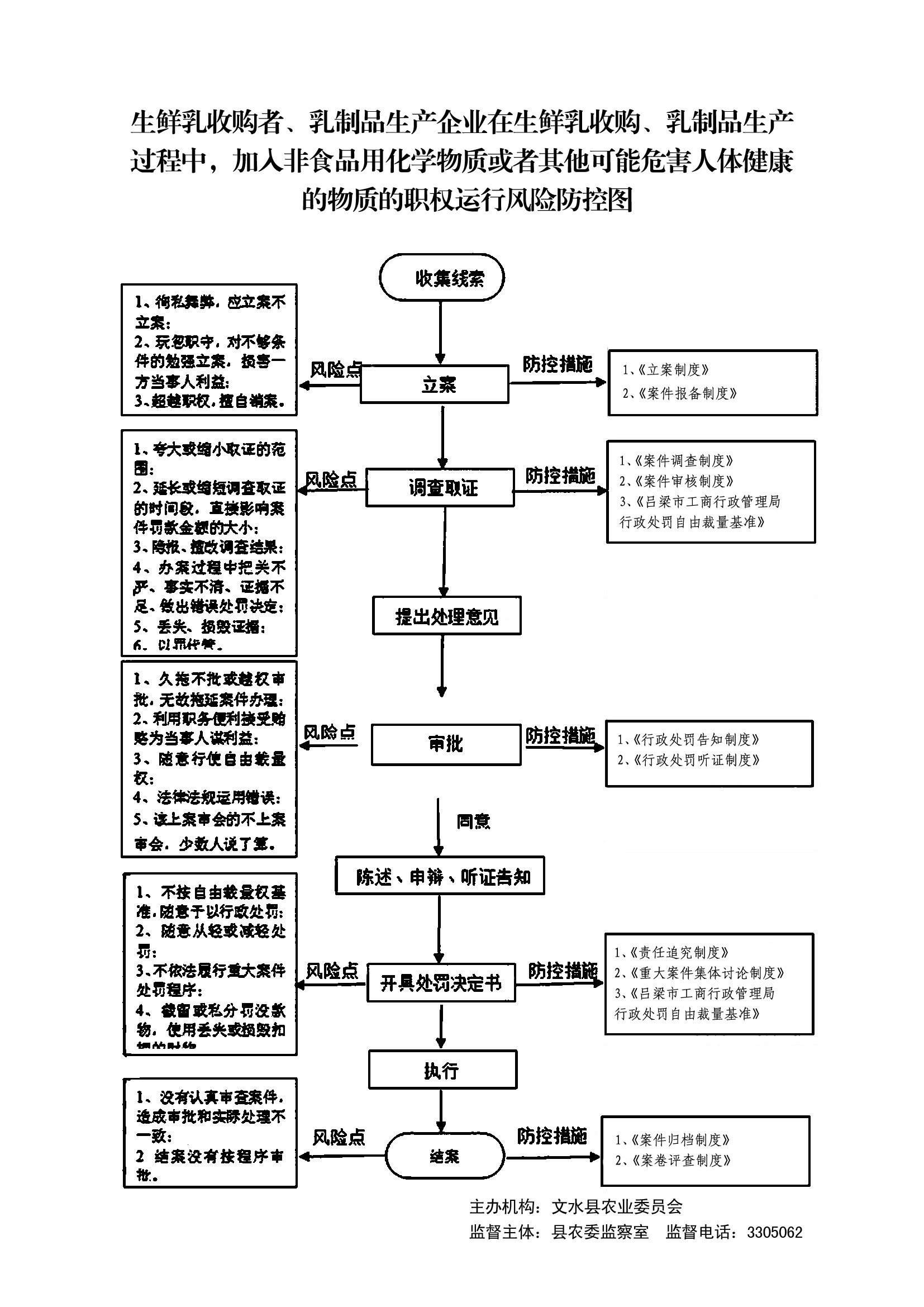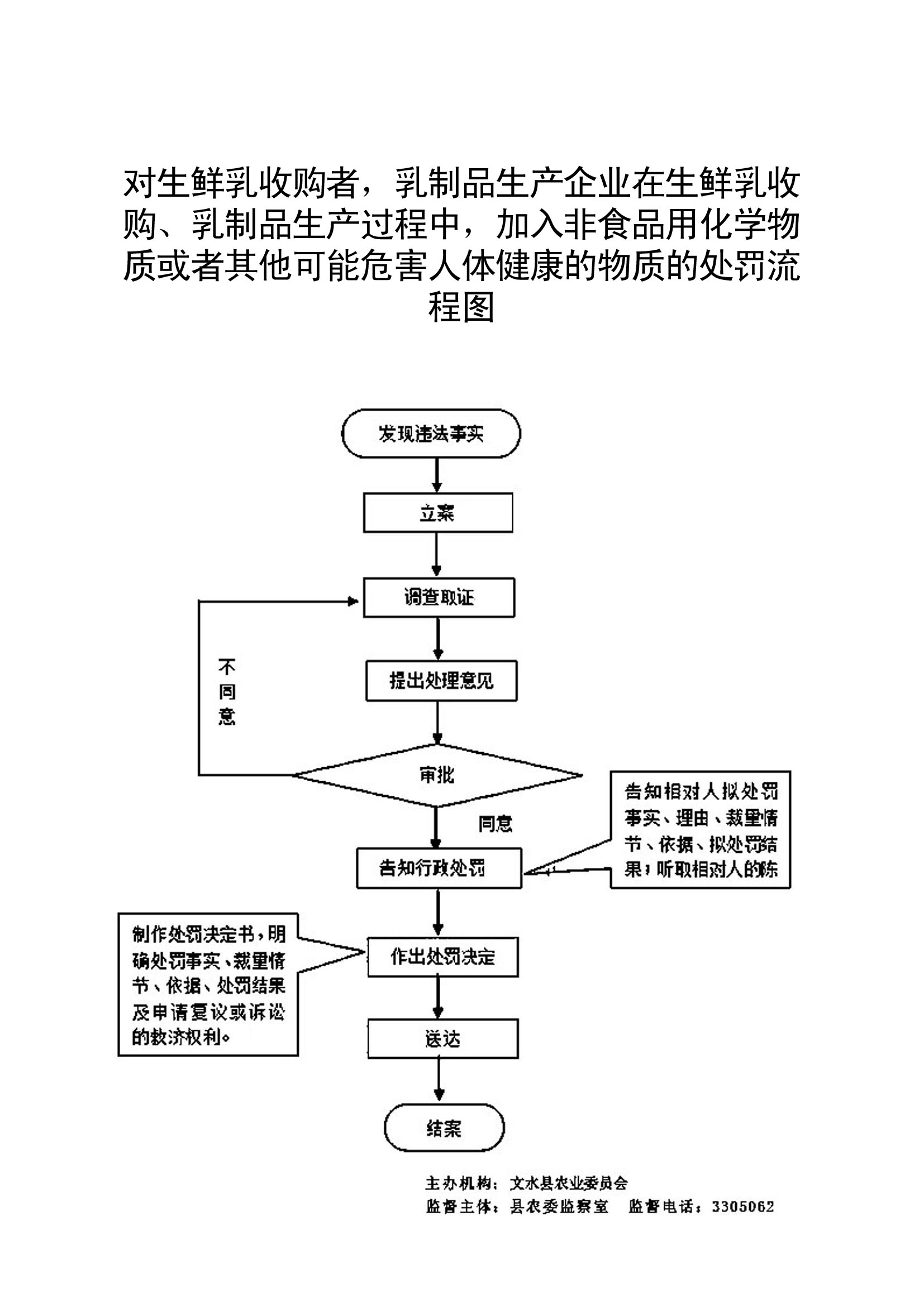 1、立案责任:发现生鲜乳收购者、乳制品生产企业在生鲜乳收购、乳制品生产过程中,加入非食品用化学物质或者其他可能危害人体健康的物质的违法行为,予以审查、决定是否立案。 2、调查责任: 对立案的案件,指定专人负责,及时组织调查取证,与当事人有直接利害关系的应到回避。执法人员不得少于两人,调查时应出示执法证件,允许当事人辩解陈述。执法人员应保守有关秘密。 3、审查责任:审理案件调查报告,对案件违法事实、证据、调查取证程序、法律适用、处罚种类和幅度、当事人陈述和身边理由等方面进行审查,提出处理意见(主要证据不足时,以适当的方式补充调查)。 4、告知责任:作出行政处罚决定前,应制作《行政处罚告知书》送达当事人,告知违法事实及其享有的陈述、申辩等权利。符合听证规定的,制作并送达《行政处罚听证告知书》。 5、决定责任:制作行政处罚决定书,载明行政处罚告知、当事人陈述申辩或者听证情况等内容。 6、送达责任:行政处罚决定书按法律规定的方式送达当事人 7、执行责任:依照生效的行政处罚决定,进行处罚。 8、其他法律法规规章文件规定应履行的责任。 |