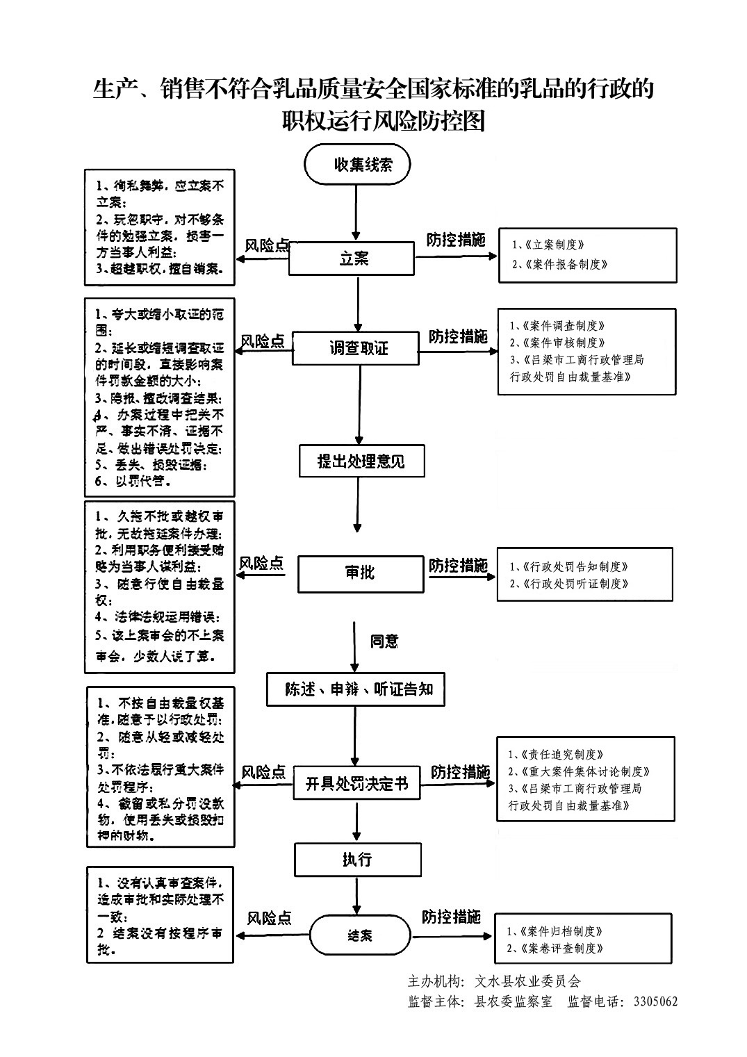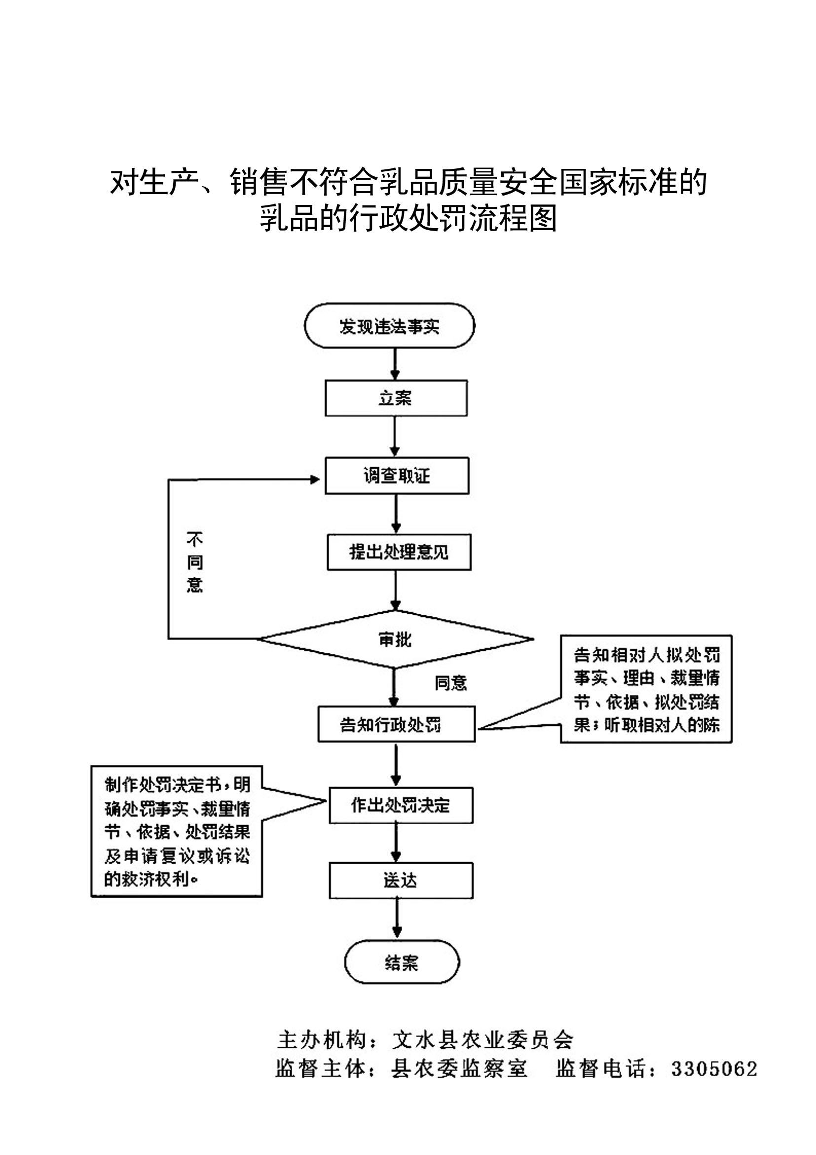 1、立案责任:发现生产、销售不符合乳品质量安全国家标准的乳品的违法行为,予以审查、决定是否立案。 2、调查责任: 对立案的案件,指定专人负责,及时组织调查取证,与当事人有直接利害关系的应到回避。执法人员不得少于两人,调查时应出示执法证件,允许当事人辩解陈述。执法人员应保守有关秘密。 3、审查责任:审理案件调查报告,对案件违法事实、证据、调查取证程序、法律适用、处罚种类和幅度、当事人陈述和身边理由等方面进行审查,提出处理意见(主要证据不足时,以适当的方式补充调查)。 4、告知责任:作出行政处罚决定前,应制作《行政处罚告知书》送达当事人,告知违法事实及其享有的陈述、申辩等权利。符合听证规定的,制作并送达《行政处罚听证告知书》。 5、决定责任:制作行政处罚决定书,载明行政处罚告知、当事人陈述申辩或者听证情况等内容。 6、送达责任:行政处罚决定书按法律规定的方式送达当事人 7、执行责任:依照生效的行政处罚决定,进行处罚。 8、其他法律法规规章文件规定应履行的责任。 |