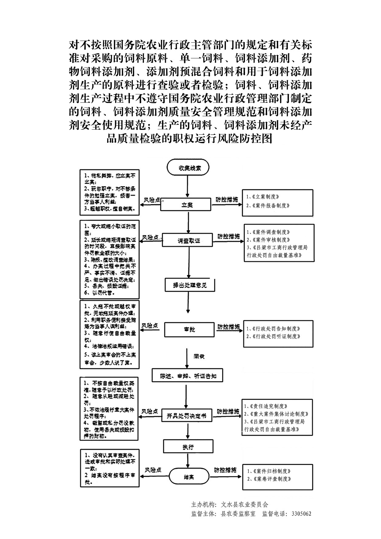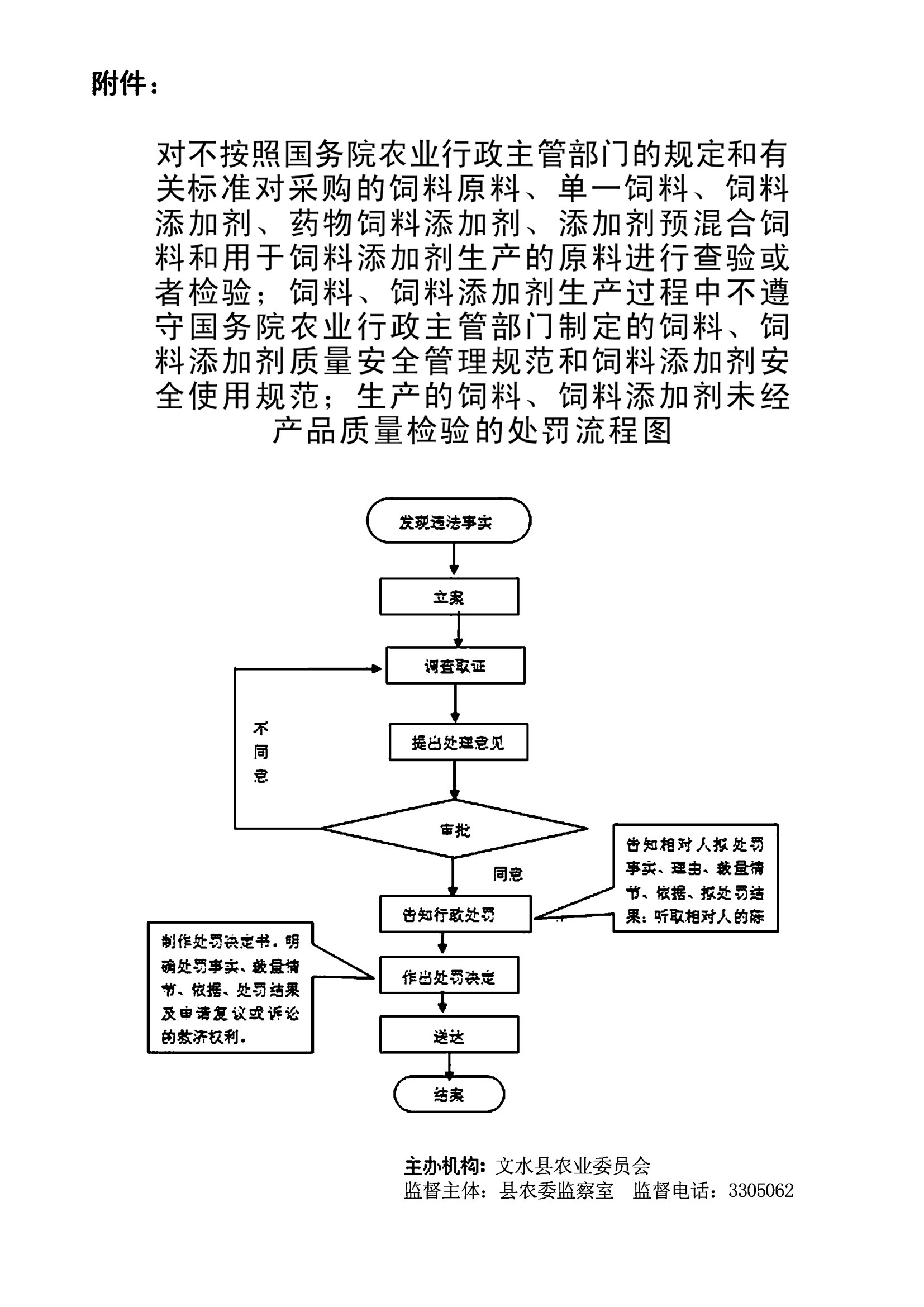 1、立案责任:发现不按照国务院农业行政主管部门的规定和有关标准对采购的饲料原料、单一饲料、饲料添加剂、药物饲料添加剂、添加剂预混合饲料和用于饲料添加剂生产的原料进行查验或者检验;饲料、饲料添加剂生产过程中不遵守国务院农业行政主管部门制定的饲料、饲料添加剂质量安全管理规范和饲料添加剂安全使用规范;生产的饲料、饲料添加剂未经产品质量检验的违法行为,予以审查、决定是否立案 2、调查责任: 对立案的案件,指定专人负责,及时组织调查取证,与当事人有直接利害关系的应到回避。执法人员不得少于两人,调查时应出示执法证件,允许当事人辩解陈述。执法人员应保守有关秘密。 3、审查责任:审理案件调查报告,对案件违法事实、证据、调查取证程序、法律适用、处罚种类和幅度、当事人陈述和身边理由等方面进行审查,提出处理意见(主要证据不足时,以适当的方式补充调查)。 4、告知责任:作出行政处罚决定前,应制作《行政处罚告知书》送达当事人,告知违法事实及其享有的 陈述、申辩等权利。符合听证规定的,制作并送达《行政处罚听证告知书》。 5、决定责任:制作行政处罚决定书,载明行政处罚告知、当事人陈述申辩或者听证情况等内容。 6、送达责任:行政处罚决定书按法律规定的方式送达当事人 7、执行责任:依照生效的行政处罚决定,进行处罚 8、其他法律法规规章文件规定应履行的责任 |