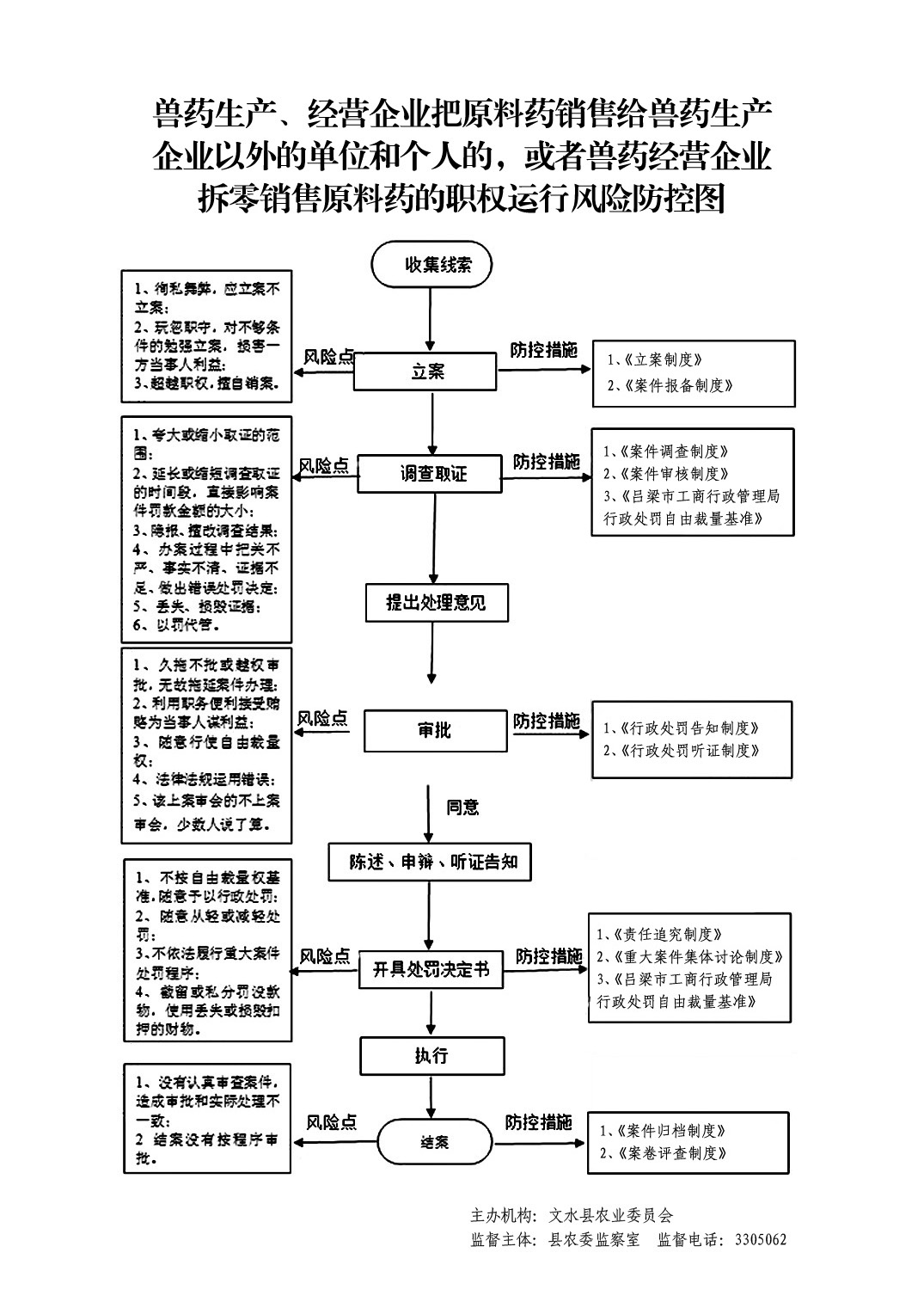 1、立案责任:发现兽药生产、经营企业把原料药销售给兽药生产企业以外的单位和个人的,或者兽药经营企业拆零销售原料药的违法行为,予以审查、决定是否立案。 2、调查责任: 对立案的案件,指定专人负责,及时组织调查取证,与当事人有直接利害关系的应到回避。执法人员不得少于两人,调查时应出示执法证件,允许当事人辩解陈述。执法人员应保守有关秘密。 3、审查责任:审理案件调查报告,对案件违法事实、证据、调查取证程序、法律适用、处罚种类和幅度、当事人陈述和身边理由等方面进行审查,提出处理意见(主要证据不足时,以适当的方式补充调查)。 4、告知责任:作出行政处罚决定前,应制作《行政处罚告知书》送达当事人,告知违法事实及其享有的 陈述、申辩等权利。符合听证规定的,制作并送达《行政处罚听证告知书》。 5、决定责任:制作行政处罚决定书,载明行政处罚告知、当事人陈述申辩或者听证情况等内容。 6、送达责任:行政处罚决定书按法律规定的方式送达当事人 7、执行责任:依照生效的行政处罚决定,进行处罚。 8、其他法律法规规章文件规定应履行的责任。 |
