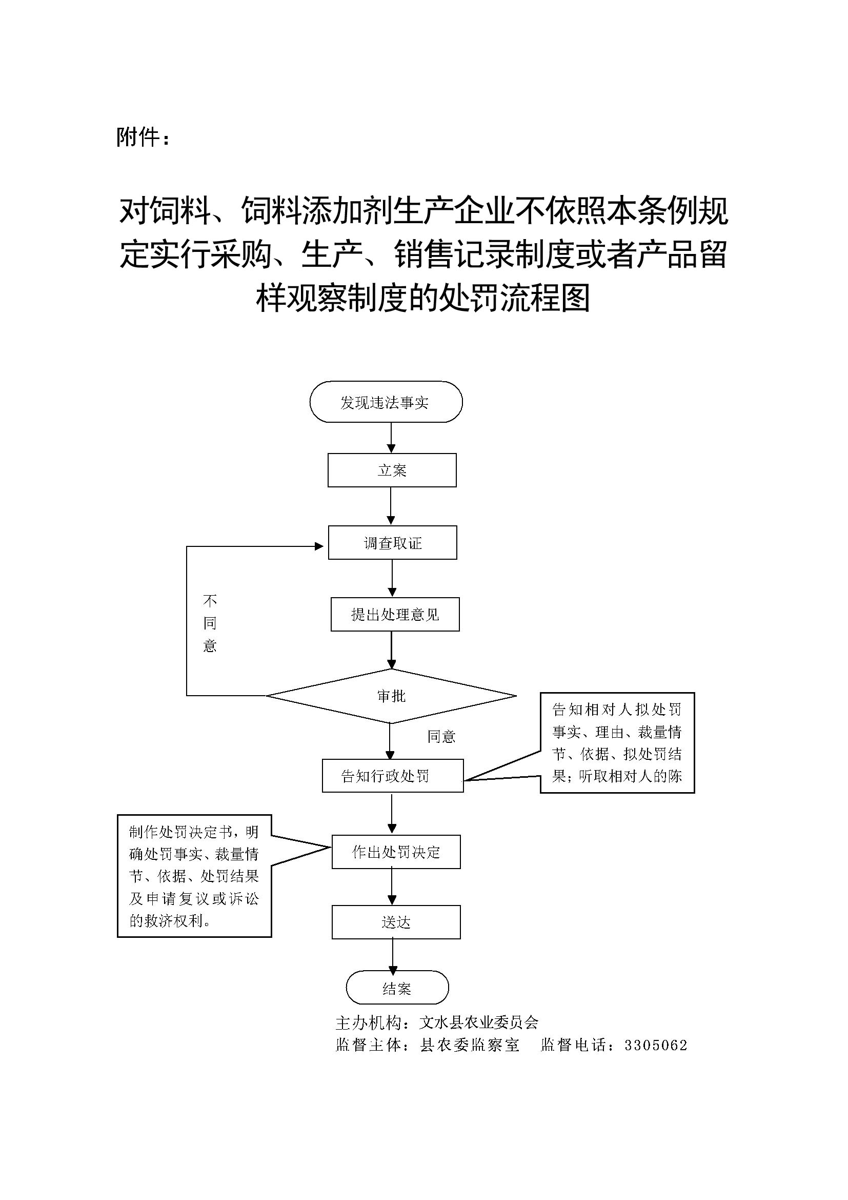1、立案责任:发现饲料、饲料添加剂生产企业不依照本条例规定实行采购、生产、销售记录制度或者产品留样观察制度的违法行为,予以审查、决定是否立案。 2、调查责任: 对立案的案件,指定专人负责,及时组织调查取证,与当事人有直接利害关系的应到回避。执法人员不得少于两人,调查时应出示执法证件,允许当事人辩解陈述。执法人员应保守有关秘密。 3、审查责任:审理案件调查报告,对案件违法事实、证据、调查取证程序、法律适用、处罚种类和幅度、当事人陈述和身边理由等方面进行审查,提出处理意见(主要证据不足时,以适当的方式补充调查)。 4、告知责任:作出行政处罚决定前,应制作《行政处罚告知书》送达当事人,告知违法事实及其享有的 陈述、申辩等权利。符合听证规定的,制作并送达《行政处罚听证告知书》。 5、决定责任:制作行政处罚决定书,载明行政处罚告知、当事人陈述申辩或者听证情况等内容。 6、送达责任:行政处罚决定书按法律规定的方式送达当事人 7、执行责任:依照生效的行政处罚决定,进行处罚。 8、其他法律法规规章文件规定应履行的责任。 |