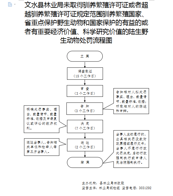 1、立案责任:发现未取得驯养繁殖许可证或者超越驯养繁殖许可证规定范围驯养繁殖国家重点保护野生动物的违法行为,予以审查,决定是否立案。 |