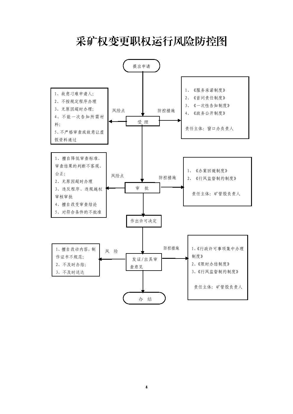 1、受理责任:公示应当提交的材料,一次告知补正材料、依法受理或者不予受理(不予受理应告知理由) 2、审查责任:对申请人提交的申请材料进行审查核实。 3、决定责任:作出行政许可或者不予行政许可决定,法定告知(不予决定应当告知理由。 4、送达责任:准予许可的向申请人颁发采矿许可证或者向吕梁市国土资源局上报。 5、事后监管责任:建立实施监督检查的运行机制和管理制度,开展基层国土中心所日常监管,依法采取相关处置措施。 6、其他法律法规规章规定应履行的责任。 |