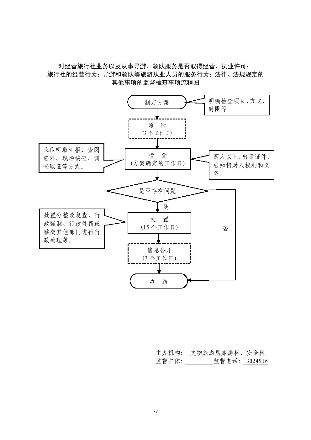 对经营旅行社业务以及从事导游、领队服务是否取得经营、执业许可;旅行社的经营行为;导游和领队等旅游从业人员的服务行为;法律、法规规定的其他事项的监督检查