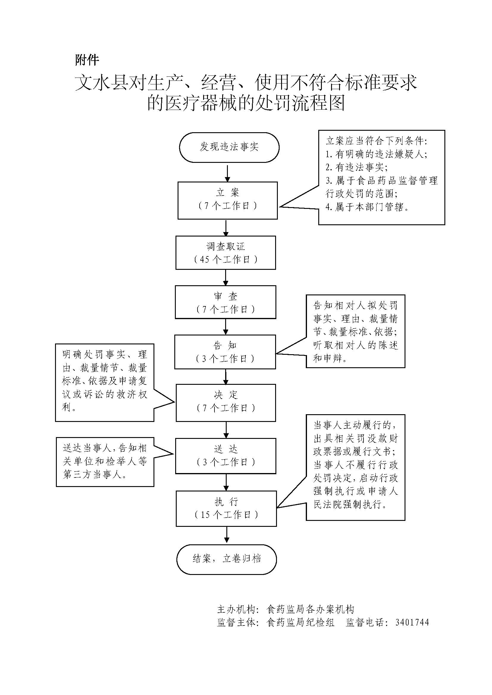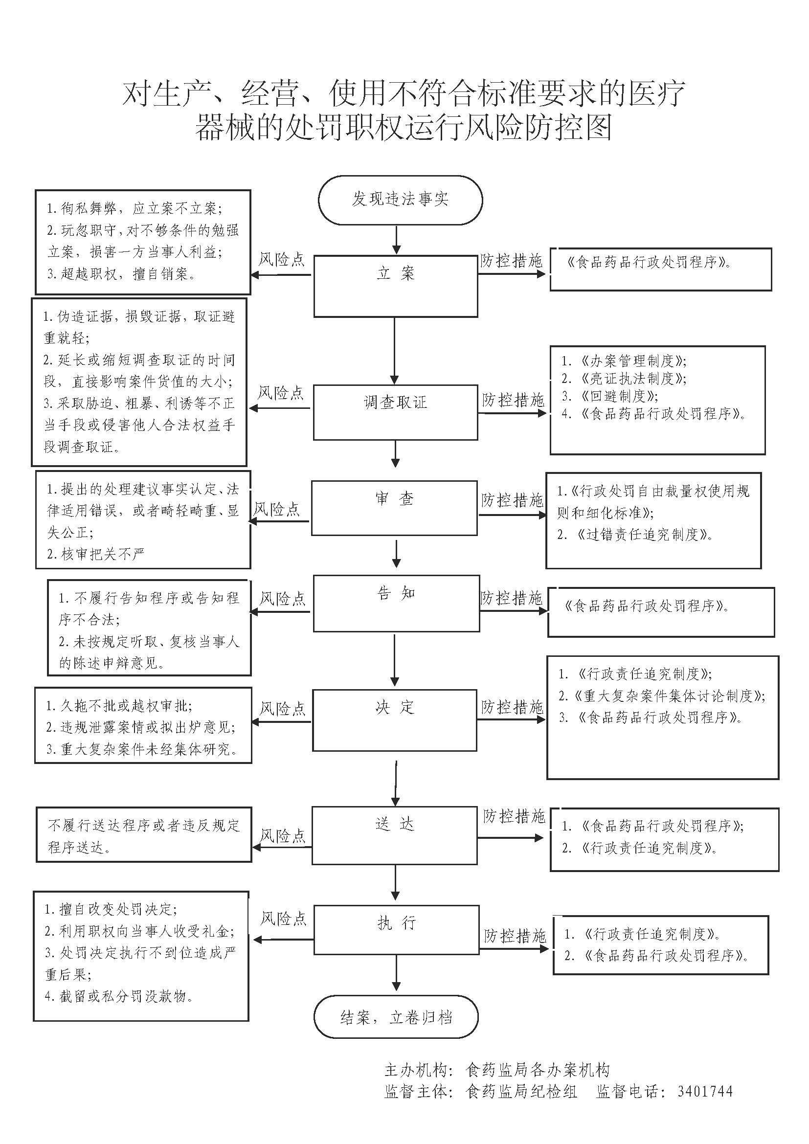| 行政处罚 | 74602117-4-CF-0048 | 对生产、经营、使用不符合标准要求的医疗器械的处罚 | 对生产、经营、使用不符合强制性标准或者不符合经注册或者备案的产品技术要求的医疗器械的处罚 对经营、使用无合格证明文件、过期、失效、淘汰的医疗器械,或者使用未依法注册的医疗器械的处罚 | 【行政法规】 《医疗器械监督管理条例》(国务院令第650号)第六十六条、第(一)第六十六条第(三)项 【规章】 《医疗器械生产监督管理办法》(2014年国家食品药品监督管理总局令第7号)第六十六条第(一)项 【规章】 《医疗器械经营监督管理办法》(2014年国家食品药品监督管理总局令第8号)第五十九条第(一)项、第五十九条第(二) 【规章】 《一次性使用无菌医疗器械监督管理办法(暂行)》(2000年国家药品监督管理局令第24号)第三十七条、第四十条 | 1.立案环节责任:在检查中发现或者接到举报有违法行为或者交办、上报、移送的此类违法案件,应予以审查,决定是否立案。 2.调查环节责任:对立案的案件,指定专人负责,与当事人有直接利害关系的应当回避。 3.审查环节责任:应当组织3名以上有关人员对违法行为的事实、性质、情节、社会危害程度、办案程序、处罚意见等进行合议审查。 4.告知环节责任:在做出处罚决定前,应书面告知当事人违法事实、处罚的理由和依据,以及当事人依法享有的陈述、申辩、要求听证等权利。 5.决定环节责任:根据审理情况决定是否予以处罚,对情节复杂或者重大违法行为给予较重的处罚,应当由食品药品监督管理部门负责人集体讨论决定。 6.送达环节责任:处罚决定书应在7日内送达当事人,邮寄送达、公告送达的期限依照《食品药品处罚程序规定》执行。 7.执行环节责任:监督当事人在决定的期限内,履行生效的处罚决定。当事人在法定期限内不申请行政复议或者提起行政诉讼,又不履行的,食品药品监督部门可依法采取加处罚款、查封扣押或向人民法院申请强制执行等措施。 8.其他法律法规规章规定应履行的责任。 | 因不履行或不正确履行行政职责,有下列情形的,行政机关及相关工作人员应承担相应责任: 1.没有法律或者事实依据实施处罚的。 2.指派不具备行政执法资格实施处罚的。 3.擅自设立处罚种类或者改变处罚幅度、范围的。 4.违反法定的处罚程序的。 5.委托不合法主体执法或二次委托执法的。 6.因处罚不当给当事人造成损失的。 7.执法人员玩忽职守,对应当予以制止和处罚的违法行为不予制止、处罚,致使公民、法人或者其他组织的合法权益、公共利益和社会秩序遭受损害的。 8.符合听证条件、行政管理相对人要求听证,应予组织听证而不组织听证的。 9.在处罚过程中发生腐败行为的。 10.处罚不使用罚款、没收财物单据或者使用非法定部门制发的罚款、没收财物单据的。 11.违反规定自行收缴罚款的,向行政机关返还罚款或者拍卖款项的。 12.将罚款、没收的违法所得或者财物截留、私分或者变相私分的。 13.其他违反法律法规规章规定的行为。 | 【法律】 《中华人民共和国行政处罚法》第五十五条、第五十六条、第五十七条、第五十八条、第五十九条、第六十条、第六十一条、第六十二条; 【行政法规】 《医疗器械监督管理条例》(国务院令第650号)第七十四条 【规章】 《山西省行政执法条例》第四十条、第四十一条、第四十二条; | 一、行政处理:诫勉谈话或者责令书面检讨;通报批评;暂扣行政执法证件;责令离岗培训;调离执法岗位,取消执法资格;依法追偿部分或者全部行政赔偿费用。 二、行政处分:警告、记过、记大过、降级、撤职、开除。 三、党纪处分:警告、严重警告、撤销党内职务、留党察看、开除党籍。 四、其他法律责任。 | |