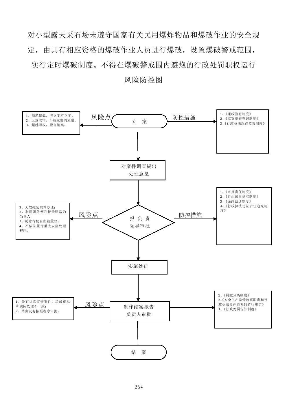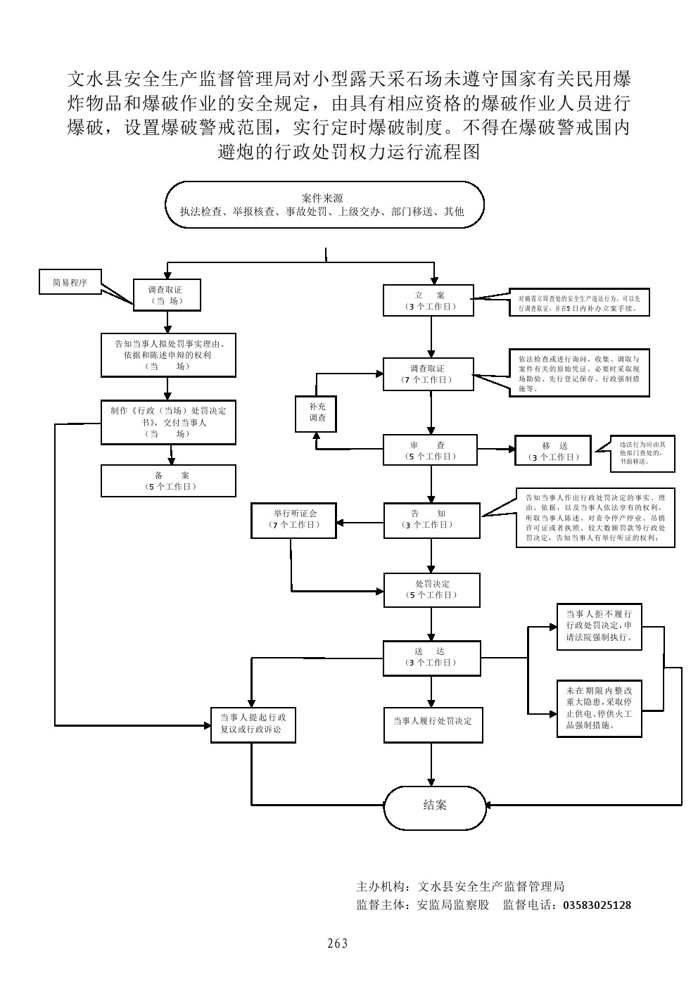 1、立案责任:在检查中或者事故调查过程中发现、或者接到举报、或部门移交的违法案件,予以审查,决定是否立案。 2、调查责任:对已经立案的案件,进行调查时,执法人员不得少于两人,与当事人有直接利害关系的应当回避。调查时应出示执法证件,收集相关证据,允许当事人辩解陈述,执法人员应保守有关秘密。 3、审查责任:对案件违法事实、证据、调查取证程序、法律适用、处罚种类和幅度、当事人陈述和申辩理由等方面进行审查,提出处理意见。 4、告知责任:在做出行政处罚决定前,制作《行政处罚告知书》,符合听证条件的制作《听证告知书》,通知当事人,当事人享有的陈述、申辩、要求听证的权利。 5、决定责任:根据审理情况决定是否予以行政处罚。依法需要给予行政处罚的,制作《行政处罚决定书》,载明违法事实和证据、处罚依据和内容、缴纳罚款的银行、申请行政复议或提起行政诉讼的途径和期限等内容。 6、送达责任:《行政处罚决定书》按照法定的方式和期限送达当事人。 7、执行责任:监督当事人在决定的期限内,履行生效的处罚决定。当事人在法定期限内不申请行政复议或者提起行政诉讼,又不履行的,发出催缴通知,加收罚款滞纳金,再不履行的向人民法院申请强制执行。 |