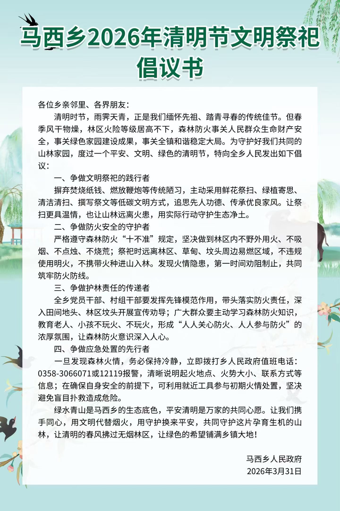 马西乡2026年清明节文明祭祀倡议书