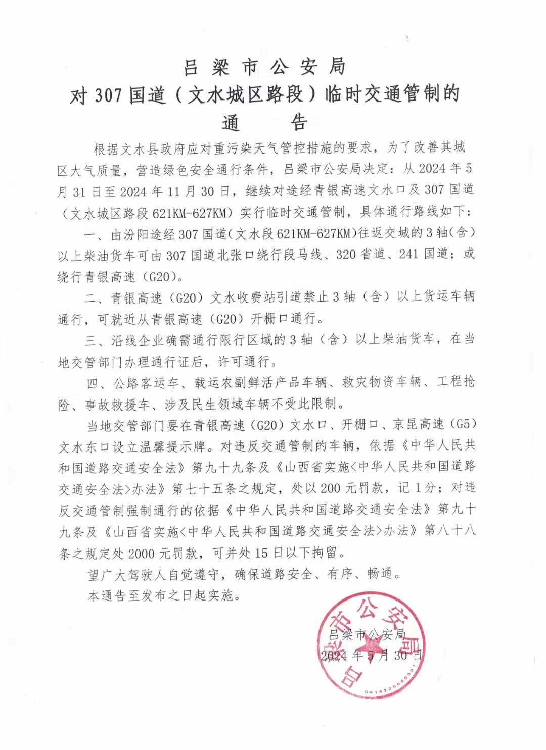 吕梁市公安局 对307 国道(文水城区路段)临时交通管制的通告