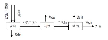 外购的三混油由槽车卸入卸油槽内,由卸油泵打入原料储罐,通过抽油泵抽至洗涤釜内。在洗涤釜中,在蒸汽加热和空气搅拌的作用下,升温至80℃,保温并静置30min,得到上层的已洗三混油,下层为酚钠盐。下层的酚钠盐流入酚钠盐中间槽。上层的已洗三混油由抽油泵打至工业萘蒸馏工段。