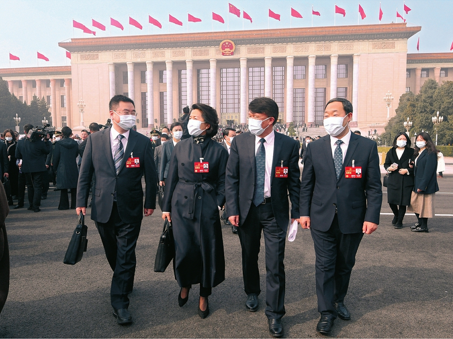 3月5日上午,第十四届全国人民代表大会第一次会议开幕会后,我省代表(左起)解军、阎美蓉、常国华、常书铭走出人民大会堂,仍在热烈讨论政府工作报告。(李联军摄)