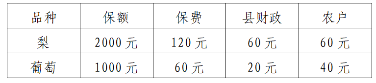 4、保险金额及费率:根据“低收费、低保障、广覆盖”原则,参照梨、葡萄生长期内所发生的直接物化成本(包括:苗木成本、化肥成本、农药成本、灌溉成本、机耕成本和地膜成本),确定梨每亩保险金额2000元,费率6%,保费120元;葡萄每亩保险金额1000元,费率6%,保费60元。