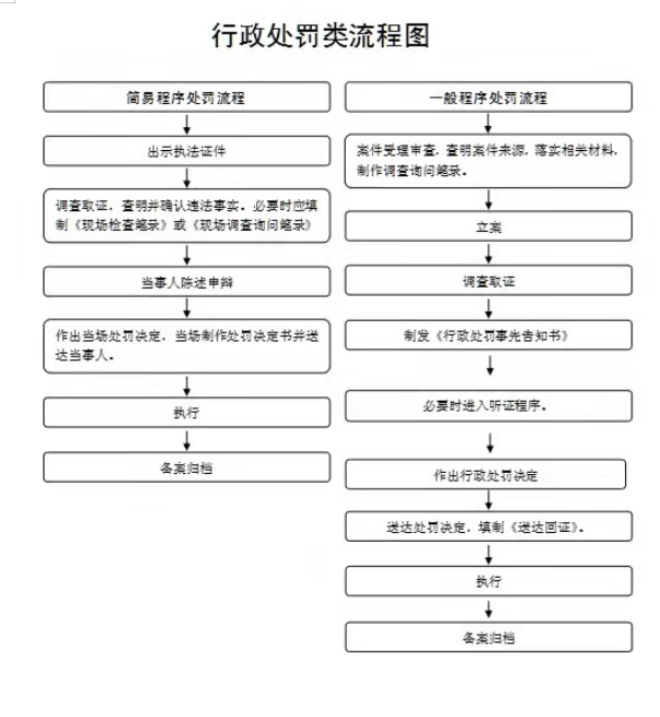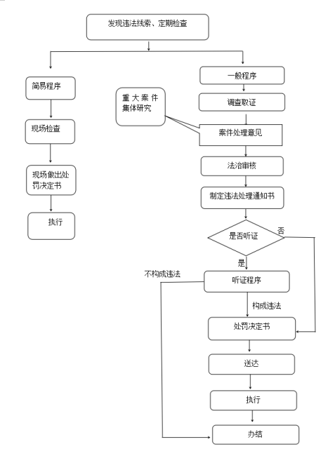 发现违法事实→立案→调查取证(2人以上)→审查→处罚决定预先告知→处罚决定→送达→执行→结案。