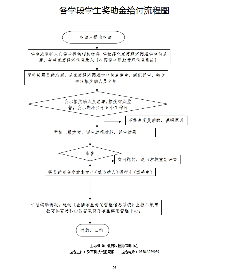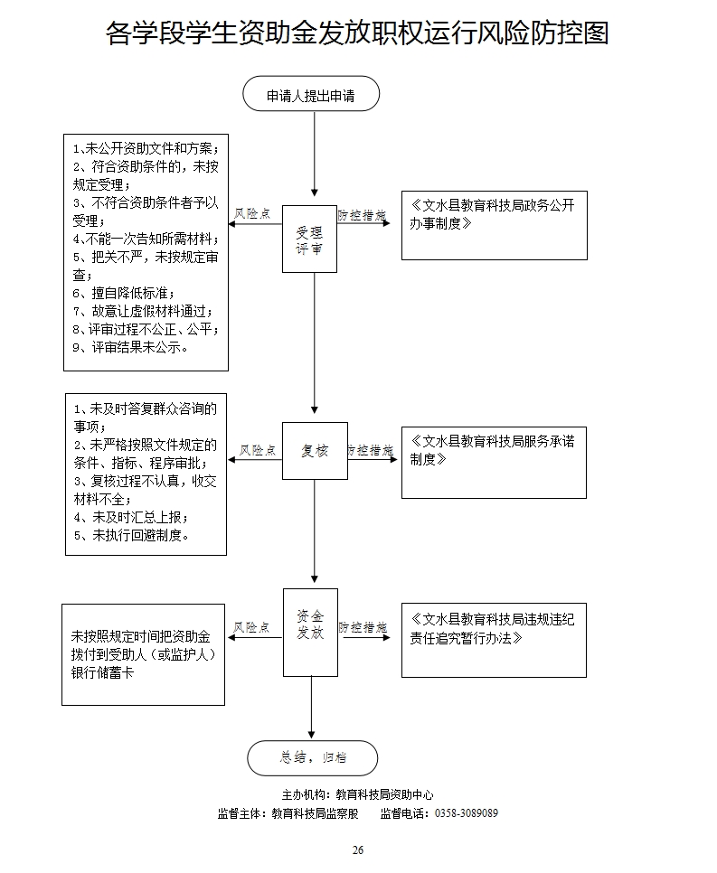1.受理评审责任:公开奖助资金文件和方案;按规定受理符合资助条件人的申请;严格把关,按照规定审查;公开公正评审;公示评审结果。 2.复核责任:严格按照文件规定的条件、指标、程序审批;及时汇总上报。 3.资金发放责任:按照规定时间把奖资助金拨付到受助人(或监护人)银行储蓄卡或手中。 4.其他法律法规规章规定应履行的责任。 |