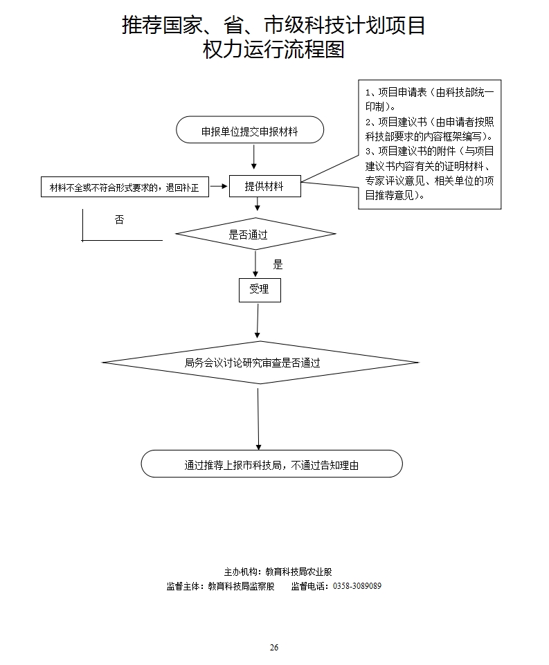 1.受理及核查责任:申报单位提交推荐国家、省、市级科技计划项目申报材料,接到申报材料视为受理。 审查及审批责任:局务会议讨论研究审查是否通过,通过推荐上报市科技局,不通过告知理由。 3.其他法律法规规章规定应履行的责任。 2. |