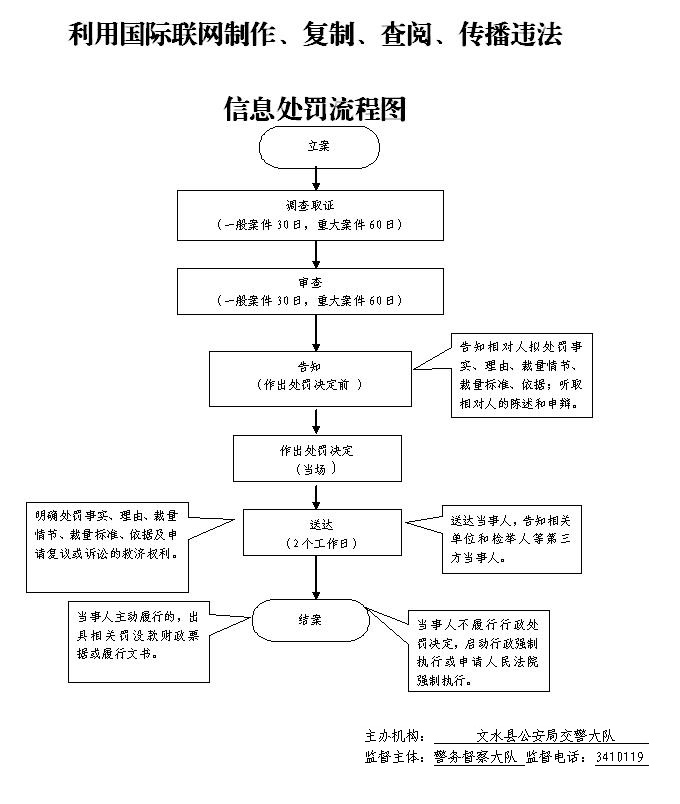 1.受理责任:报案、控告、举报、群众扭送、主动投案时,审查决定是否予以受理;2.承办责任:对受理的案件,指定专人负责,及时组织调查取证,与当事人有直接利害关系的应回避。办案人员不得少于两人,办案时应当严格遵守执法办案相关规定,允许当事人辩解陈述。办案人员应保守有关秘密。3.审批责任:对办案民警呈送的案件审批,主要对对案件违法事实、证据、调查取证程序、法律适用、处罚种类和幅度、当事人陈述等方面进行审查,提出处理意见(主要证据不足时,以适当的方式补充调查)。4.告知责任:作出行政处罚决定前,应制作《行政处罚告知书》送达当事人,告知违法事实及其享有的 陈述、申辩等权利。5.决定责任:制作行政处罚决定书,载明行政处罚告知、当事人陈述申辩或者听证情况等内容。6.送达责任:行政处罚决定书按法律规定的方式送达当事人7.执行责任:依照生效的行政处罚决定执行。8.其他法律法规规章文件规定应履行的责任。 |