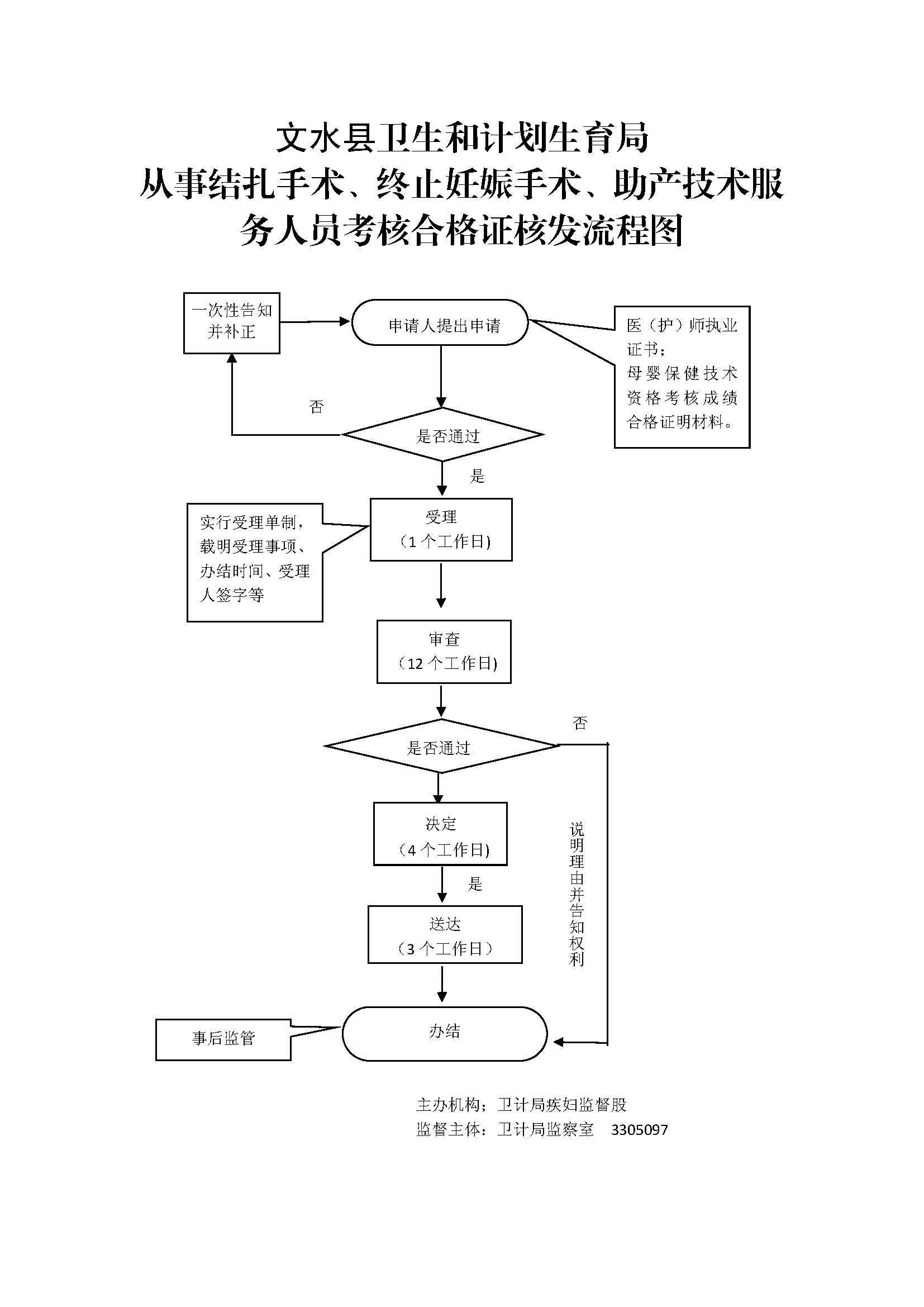 1.受理环节责任:公示从事结扎手术、终止妊娠手术、助产技术服务人员考核合格证核发依法应当提交的材料和受理条件;一次性告知补齐补正材料;依法受理或不予受理(不予受理应当告知理由)。 |