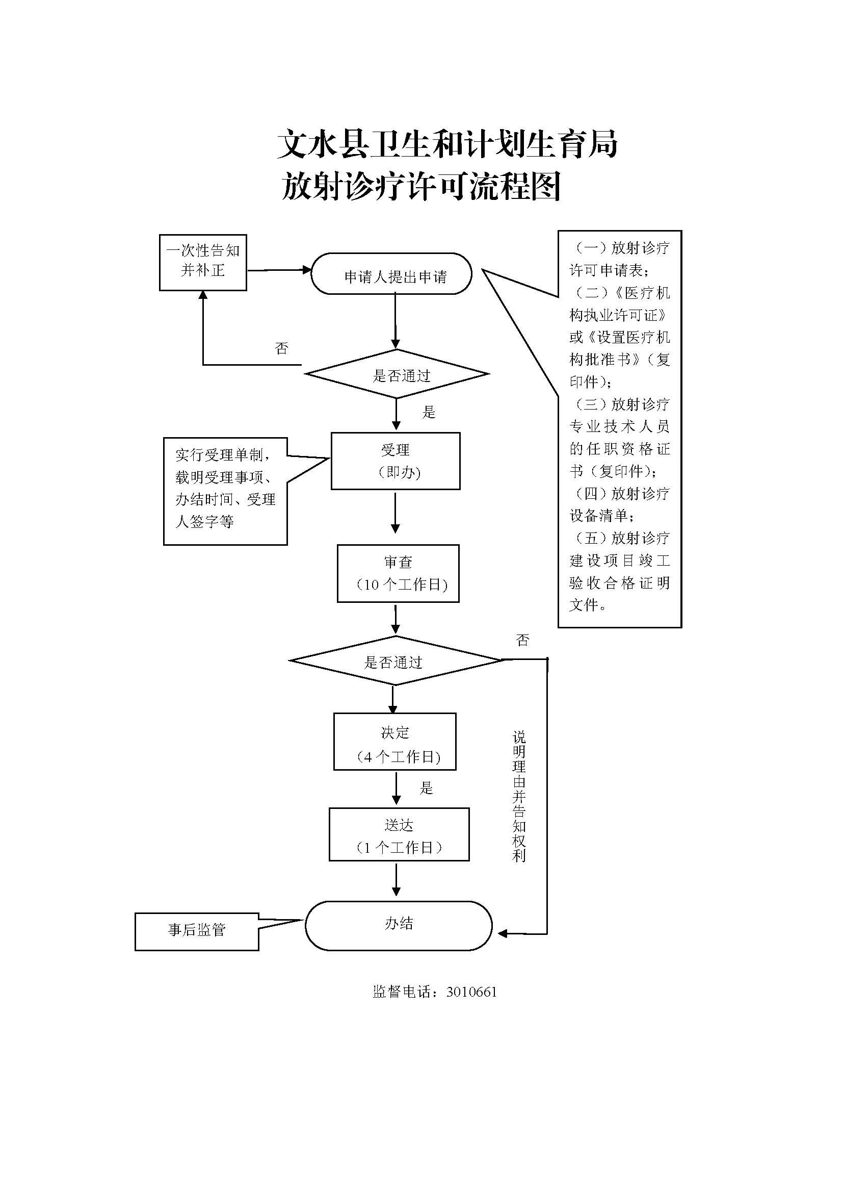 1.受理环节责任:公示放射诊疗许可依法应当提交的材料和受理条件;一次性告知补齐补正材料;依法受理或不予受理(不予受理应当告知理由)。 |