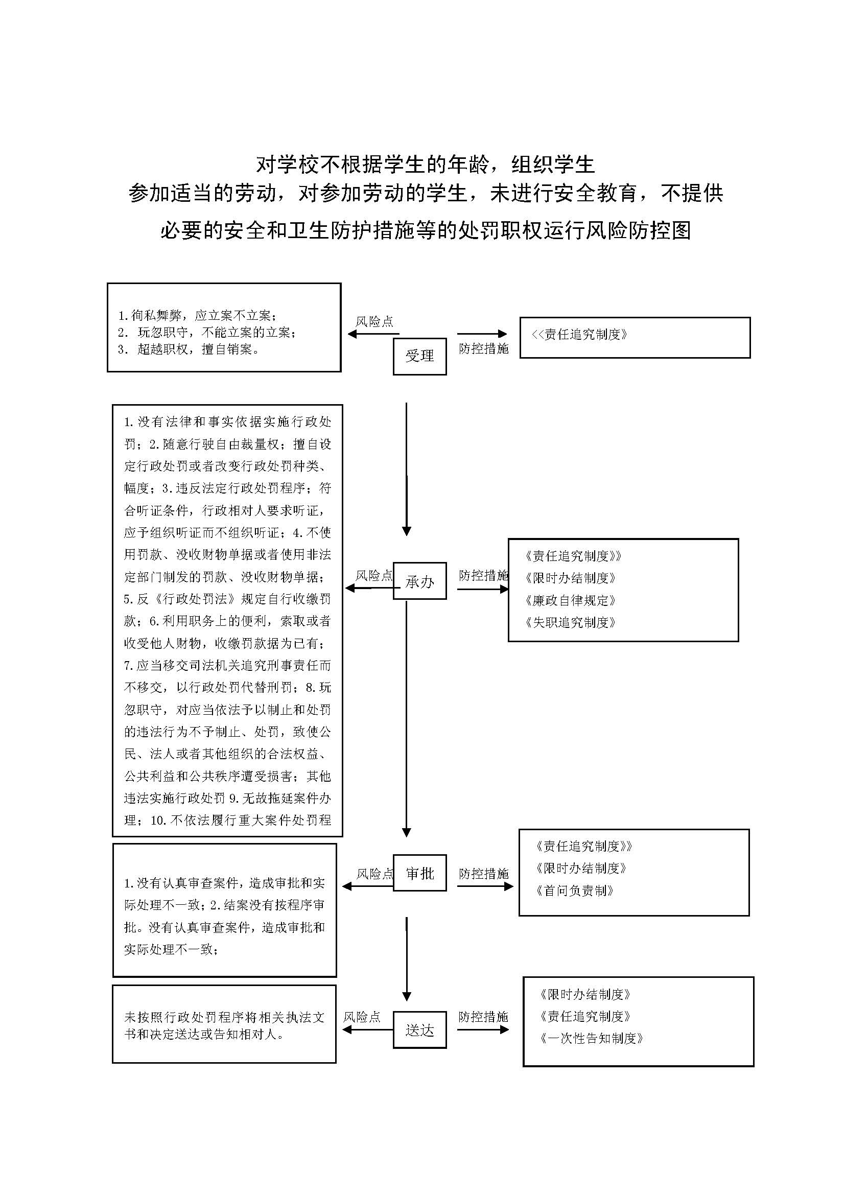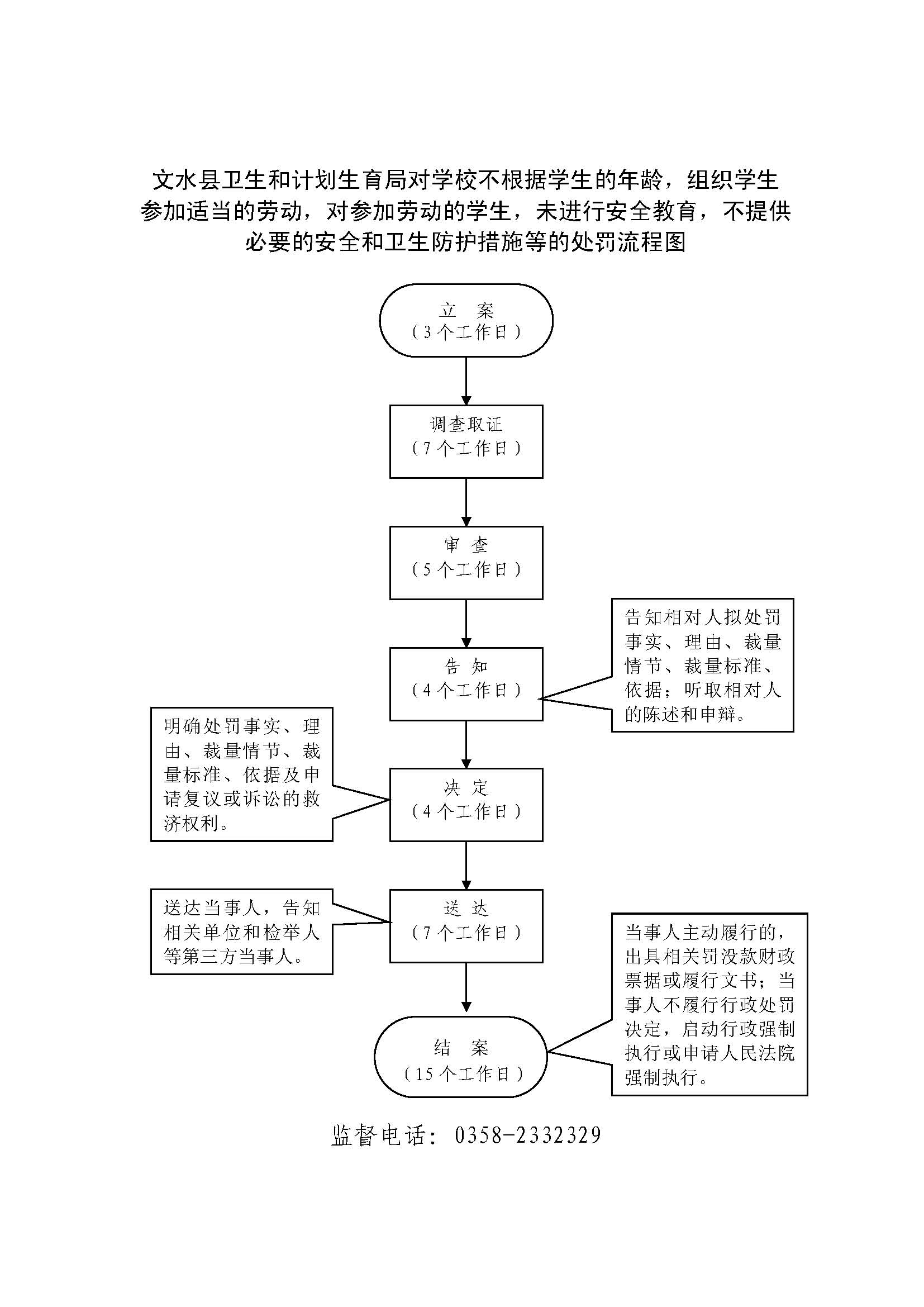 1、立案责任:发现学校不根据学生的年龄,组织学生参加适当的劳动,对参加劳动的学生,未进行安全教育,不提供必要的安全和卫生防护措施、普通中小学校组织学生参加劳动,让学生接触有毒有害物质或者从事不安全工种的作业,让学生参加夜班劳动或接触有毒有害物质的,未按照国家有关规定,提供保健待遇和定期对他们进行体格检查等的违法行为或举报案件,予以审查、决定是否立案。 2、调查责任:公共综合执法科室及乡镇卫生监督站对各自辖区内立案的案件,指定专人负责,及时组织调查取证,与当事人有直接利害关系的应到回避。执法人员不得少于两人,调查时应出示执法证件,允许当事人辩解陈述。执法人员应保守有关秘密。 3、审查责任:审理案件调查报告,对案件违法事实、证据、调查取证程序、法律适用、处罚种类和幅度、当事人陈述和身边理由等方面进行审查,提出处理意见(主要证据不足时,以适当的方式补充调查)。 4、告知责任:作出行政处罚决定前,应制作《行政处罚告知书》送达当事人,告知违法事实及其享有的 陈述、申辩等权利。符合听证规定的,制作并送达《行政处罚听证告知书》。 5、决定责任:制作行政处罚决定书,载明行政处罚告知、当事人陈述申辩或者听证情况等内容。 6、送达责任:行政处罚决定书按法律规定的方式送达当事人 7、执行责任:依照生效的行政处罚决定,采取罚款、责令停业等行政处罚措施。 8、其他法律法规规章文件规定应履行的责任。 |
