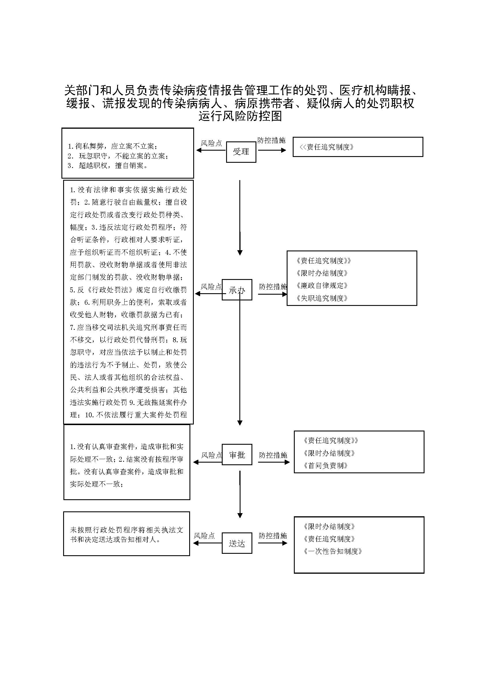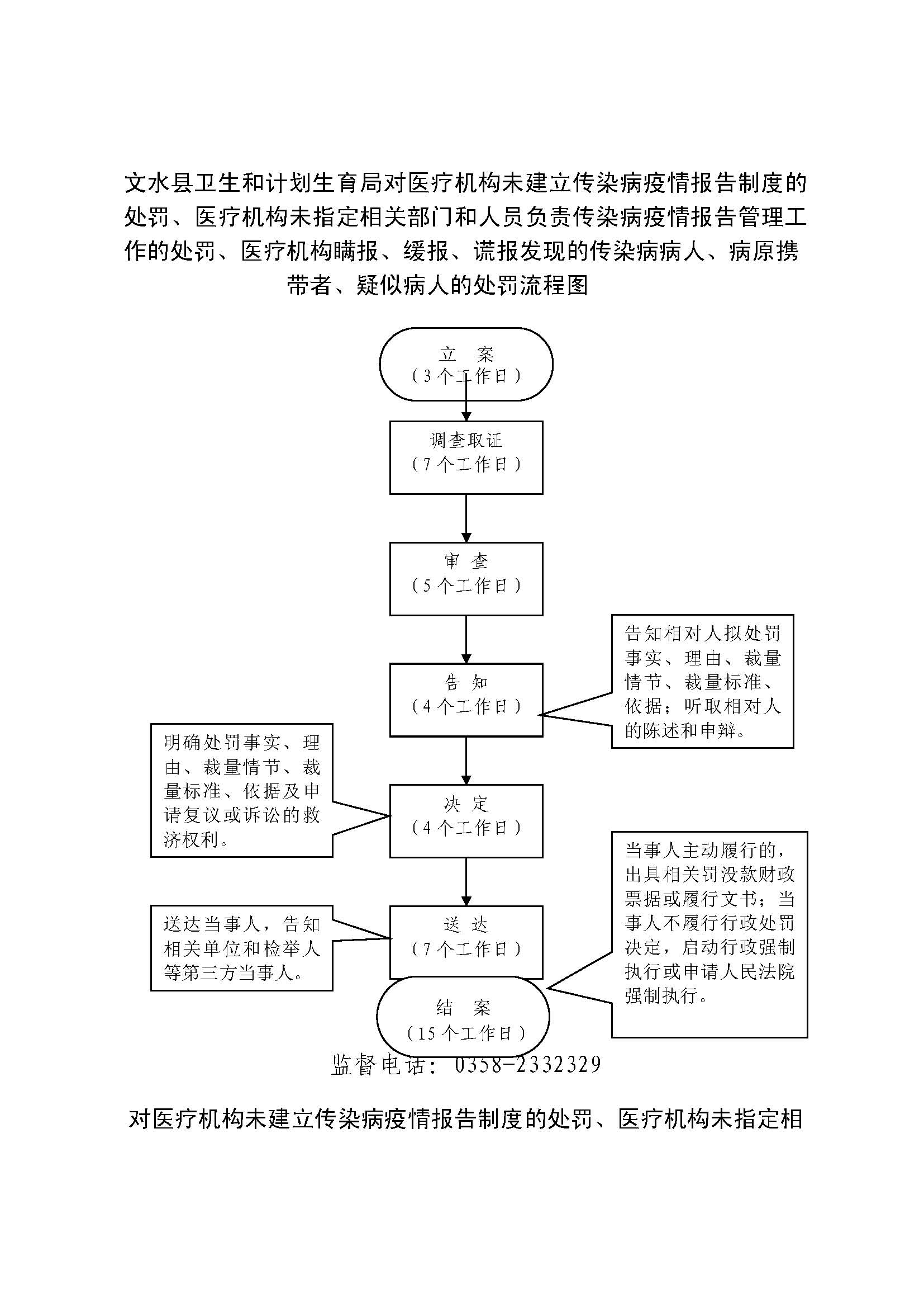 1、立案责任:发现对医疗机构未建立传染病疫情报告制度的处罚、医疗机构未指定相关部门和人员负责传染病疫情报告管理工作的处罚、医疗机构瞒报、缓报、谎报发现的传染病病人、病原携带者、疑似病人的违法行为或举报案件,予以审查、决定是否立案。 2、调查责任:公共综合执法科室及乡镇卫生监督站对各自辖区内立案的案件,指定专人负责,及时组织调查取证,与当事人有直接利害关系的应到回避。执法人员不得少于两人,调查时应出示执法证件,允许当事人辩解陈述。执法人员应保守有关秘密。 3、审查责任:审理案件调查报告,对案件违法事实、证据、调查取证程序、法律适用、处罚种类和幅度、当事人陈述和身边理由等方面进行审查,提出处理意见(主要证据不足时,以适当的方式补充调查)。 4、告知责任:作出行政处罚决定前,应制作《行政处罚告知书》送达当事人,告知违法事实及其享有的 陈述、申辩等权利。符合听证规定的,制作并送达《行政处罚听证告知书》。 5、决定责任:制作行政处罚决定书,载明行政处罚告知、当事人陈述申辩或者听证情况等内容。 6、送达责任:行政处罚决定书按法律规定的方式送达当事人 7、执行责任:依照生效的行政处罚决定,采取罚款、责令停业等行政处罚措施。 8、其他法律法规规章文件规定应履行的责任。 |