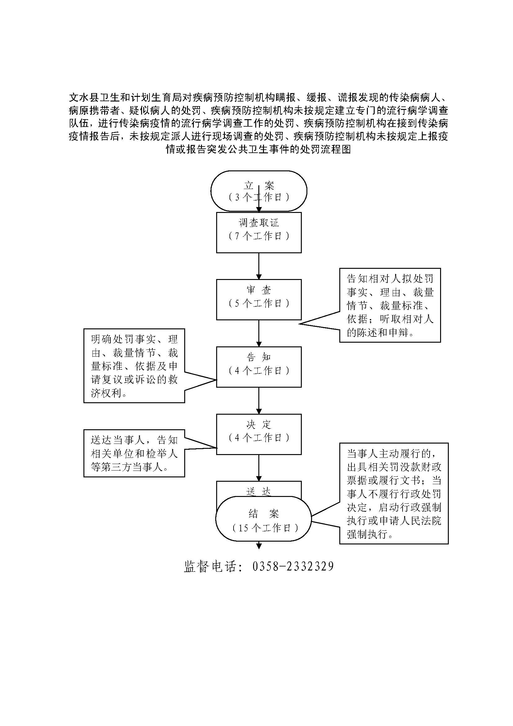 1、立案责任:发现疾病预防控制机构瞒报、缓报、谎报发现的传染病病人、病原携带者、疑似病人的处罚、疾病预防控制机构未按规定建立专门的流行病学调查队伍,进行传染病疫情的流行病学调查工作的处罚、疾病预防控制机构在接到传染病疫情报告后,未按规定派人进行现场调查的处罚、疾病预防控制机构未按规定上报疫情或报告突发公共卫生事件的违法行为或举报案件,予以审查、决定是否立案。 2、调查责任:公共综合执法科室及乡镇卫生监督站对各自辖区内立案的案件,指定专人负责,及时组织调查取证,与当事人有直接利害关系的应到回避。执法人员不得少于两人,调查时应出示执法证件,允许当事人辩解陈述。执法人员应保守有关秘密。 3、审查责任:审理案件调查报告,对案件违法事实、证据、调查取证程序、法律适用、处罚种类和幅度、当事人陈述和身边理由等方面进行审查,提出处理意见(主要证据不足时,以适当的方式补充调查)。 4、告知责任:作出行政处罚决定前,应制作《行政处罚告知书》送达当事人,告知违法事实及其享有的 陈述、申辩等权利。符合听证规定的,制作并送达《行政处罚听证告知书》。 5、决定责任:制作行政处罚决定书,载明行政处罚告知、当事人陈述申辩或者听证情况等内容。 6、送达责任:行政处罚决定书按法律规定的方式送达当事人 7、执行责任:依照生效的行政处罚决定,采取罚款、责令停业等行政处罚措施。 8、其他法律法规规章文件规定应履行的责任。 |