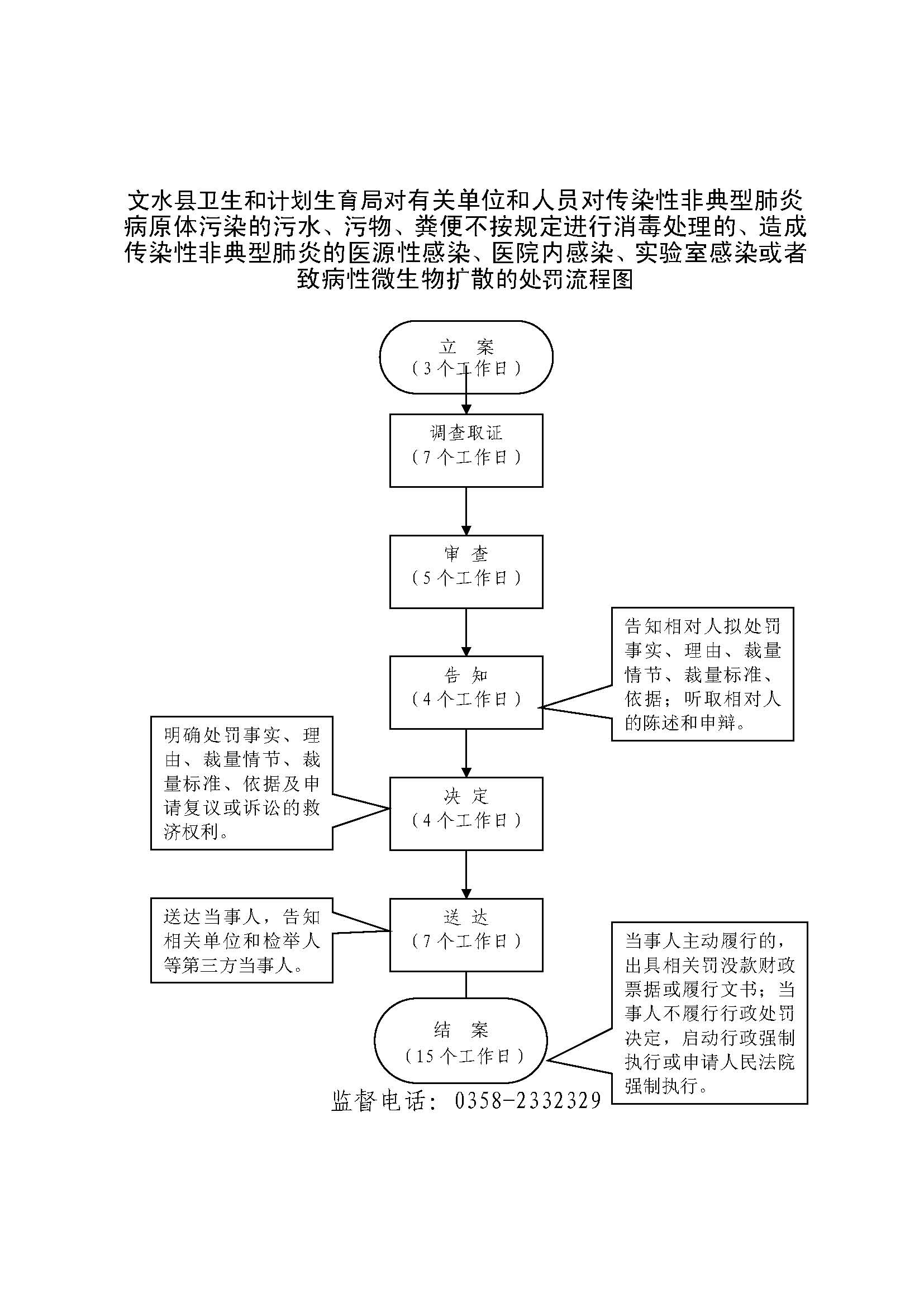 1、立案责任:发现有关单位和人员对传染性非典型肺炎病原体污染的污水、污物、粪便不按规定进行消毒处理的处罚、有关单位和人员造成传染性非典型肺炎的医源性感染、医院内感染、实验室感染或者致病性微生物扩散的处罚、有关单位和人员生产、经营、使用消毒产品、隔离防护用品等不符合规定与标准,可能造成传染病的传播、扩散或者造成传染病的传播、扩散的处罚等的违法行为或举报案件,予以审查、决定是否立案。 2、调查责任:公共综合执法科室及乡镇卫生监督站对各自辖区内立案的案件,指定专人负责,及时组织调查取证,与当事人有直接利害关系的应到回避。执法人员不得少于两人,调查时应出示执法证件,允许当事人辩解陈述。执法人员应保守有关秘密。 3、审查责任:审理案件调查报告,对案件违法事实、证据、调查取证程序、法律适用、处罚种类和幅度、当事人陈述和身边理由等方面进行审查,提出处理意见(主要证据不足时,以适当的方式补充调查)。 4、告知责任:作出行政处罚决定前,应制作《行政处罚告知书》送达当事人,告知违法事实及其享有的 陈述、申辩等权利。符合听证规定的,制作并送达《行政处罚听证告知书》。 5、决定责任:制作行政处罚决定书,载明行政处罚告知、当事人陈述申辩或者听证情况等内容。 6、送达责任:行政处罚决定书按法律规定的方式送达当事人 7、执行责任:依照生效的行政处罚决定,采取罚款、责令停业等行政处罚措施。 8、其他法律法规规章文件规定应履行的责任。 |