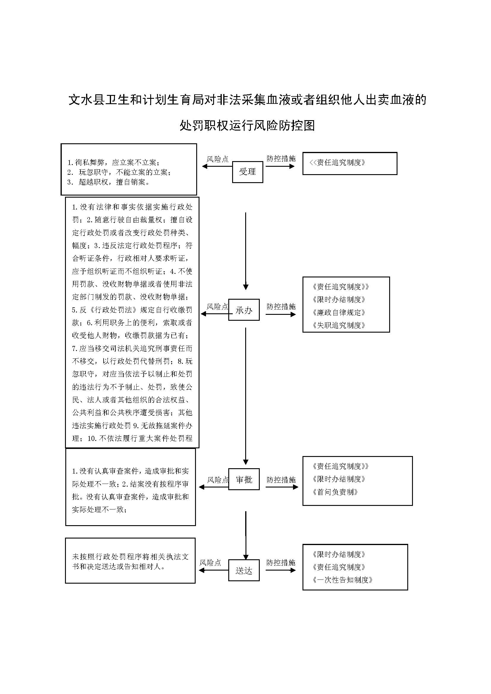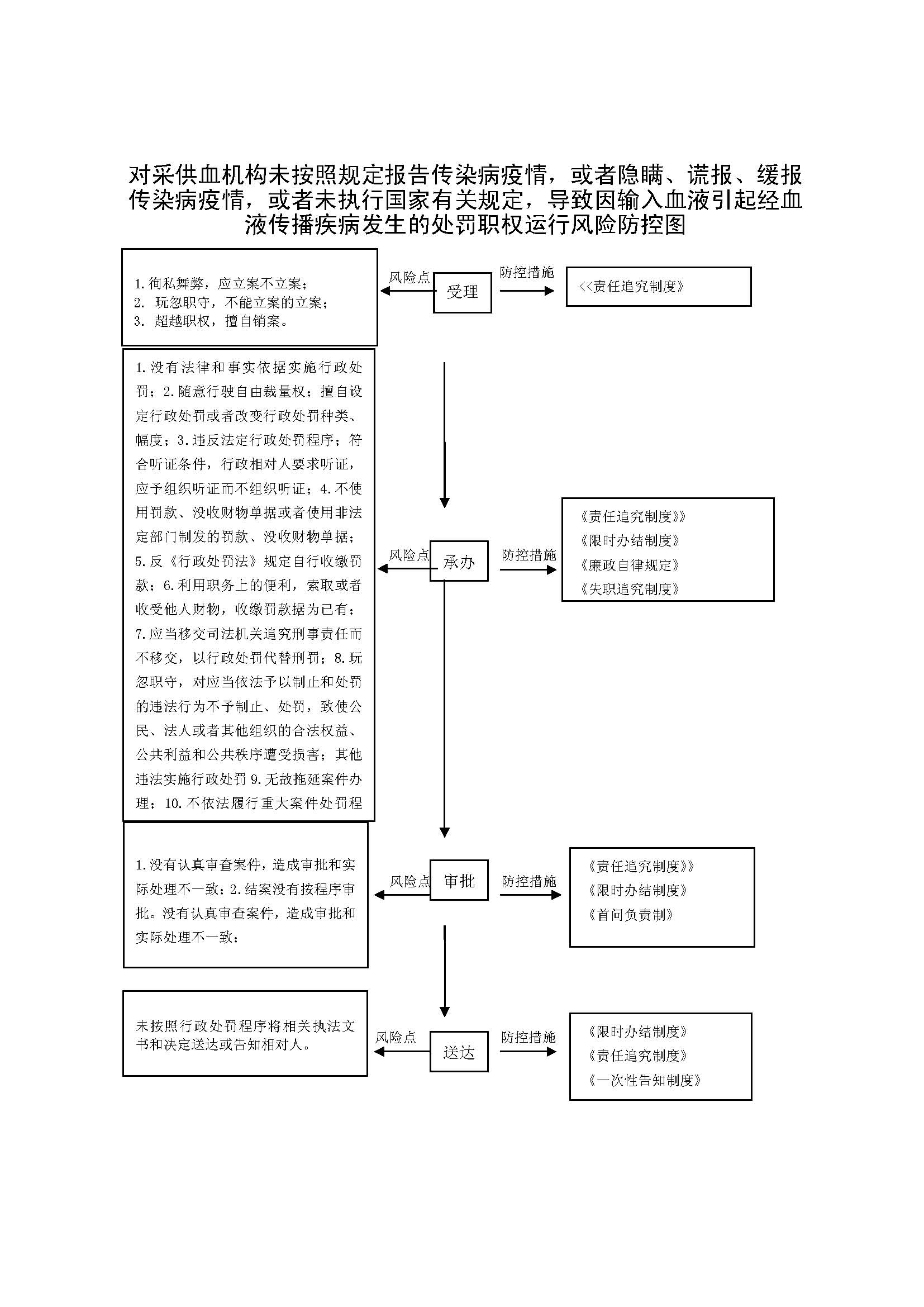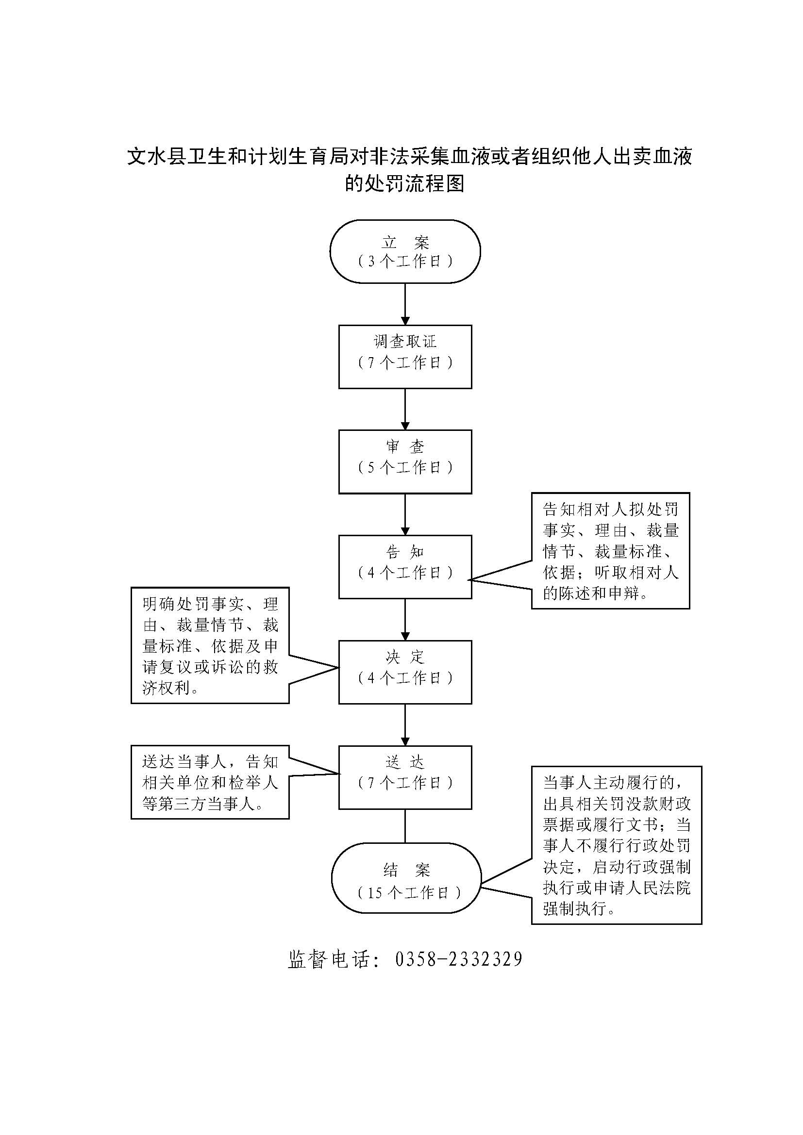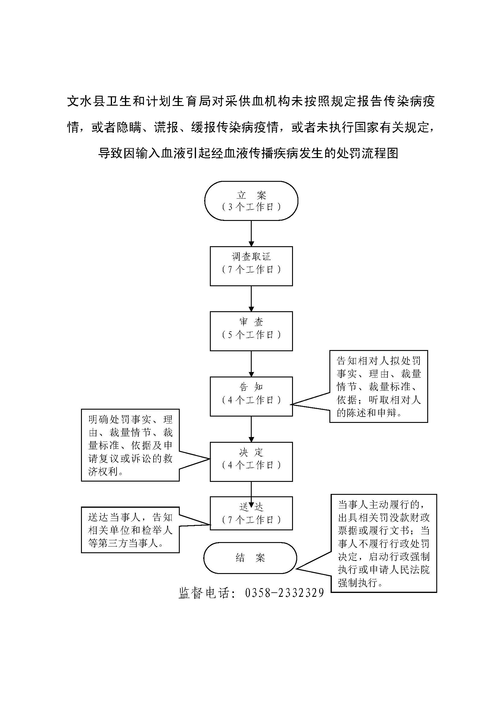 1、立案责任:发现采供血机构违反传染病防治有关规定的违法行为或举报案件,予以审查、决定是否立案。 2、调查责任:公共综合执法科室及乡镇卫生监督站对各自辖区内立案的案件,指定专人负责,及时组织调查取证,与当事人有直接利害关系的应到回避。执法人员不得少于两人,调查时应出示执法证件,允许当事人辩解陈述。执法人员应保守有关秘密。 3、审查责任:审理案件调查报告,对案件违法事实、证据、调查取证程序、法律适用、处罚种类和幅度、当事人陈述和身边理由等方面进行审查,提出处理意见(主要证据不足时,以适当的方式补充调查)。 4、告知责任:作出行政处罚决定前,应制作《行政处罚告知书》送达当事人,告知违法事实及其享有的 陈述、申辩等权利。符合听证规定的,制作并送达《行政处罚听证告知书》。 5、决定责任:制作行政处罚决定书,载明行政处罚告知、当事人陈述申辩或者听证情况等内容。 6、送达责任:行政处罚决定书按法律规定的方式送达当事人 7、执行责任:依照生效的行政处罚决定,采取罚款、责令停业等行政处罚措施。 8、其他法律法规规章文件规定应履行的责任。 |