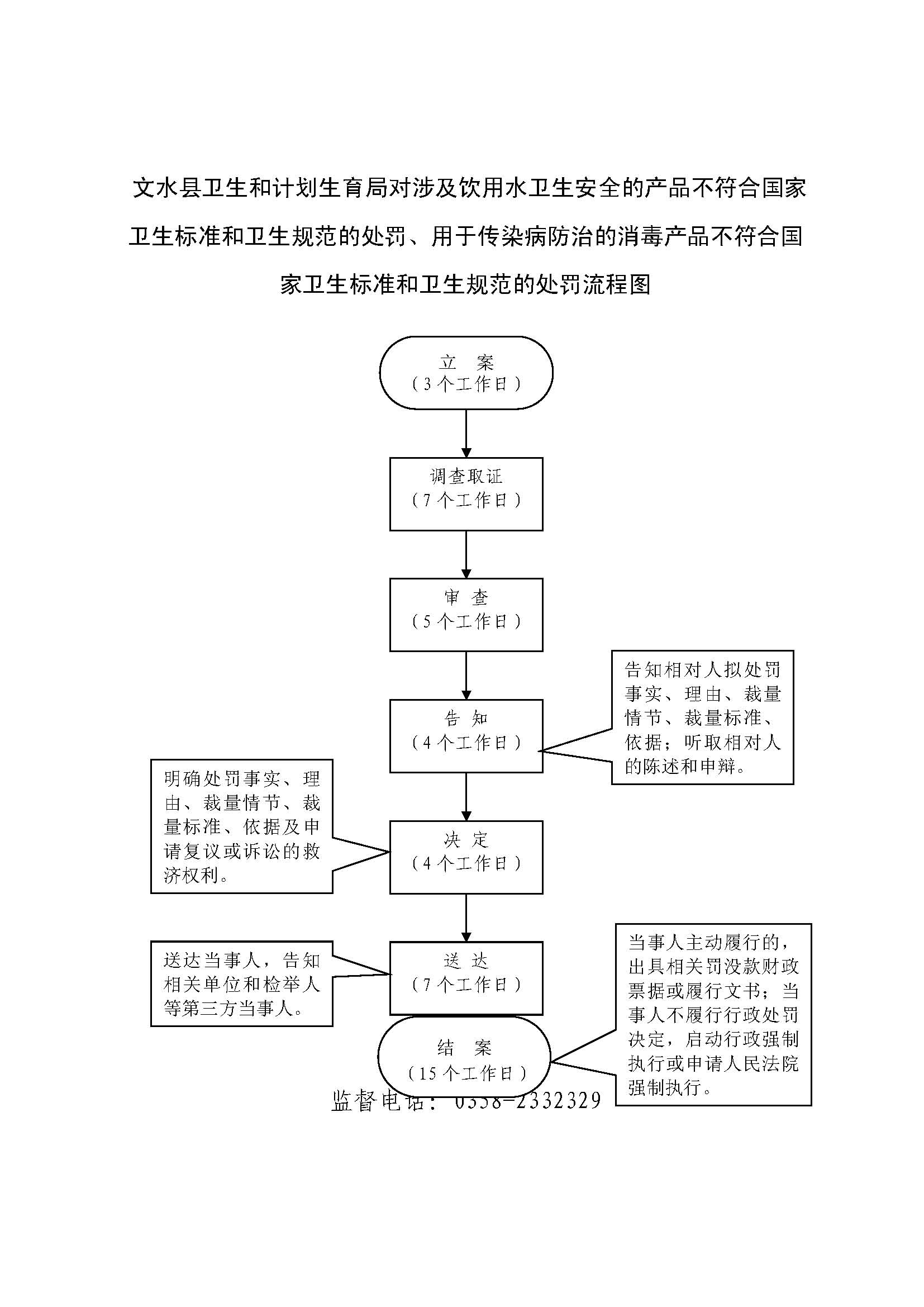 1、立案责任:发现对涉及饮用水卫生安全的产品不符合国家卫生标准和卫生规范的处罚、用于传染病防治的消毒产品不符合国家卫生标准和卫生规范的违法行为或举报案件,予以审查、决定是否立案。 2、调查责任:公共综合执法科室及乡镇卫生监督站对各自辖区内立案的案件,指定专人负责,及时组织调查取证,与当事人有直接利害关系的应到回避。执法人员不得少于两人,调查时应出示执法证件,允许当事人辩解陈述。执法人员应保守有关秘密。 3、审查责任:审理案件调查报告,对案件违法事实、证据、调查取证程序、法律适用、处罚种类和幅度、当事人陈述和身边理由等方面进行审查,提出处理意见(主要证据不足时,以适当的方式补充调查)。 4、告知责任:作出行政处罚决定前,应制作《行政处罚告知书》送达当事人,告知违法事实及其享有的 陈述、申辩等权利。符合听证规定的,制作并送达《行政处罚听证告知书》。 5、决定责任:制作行政处罚决定书,载明行政处罚告知、当事人陈述申辩或者听证情况等内容。 6、送达责任:行政处罚决定书按法律规定的方式送达当事人 7、执行责任:依照生效的行政处罚决定,采取罚款、责令停业等行政处罚措施。 8、其他法律法规规章文件规定应履行的责任。 |