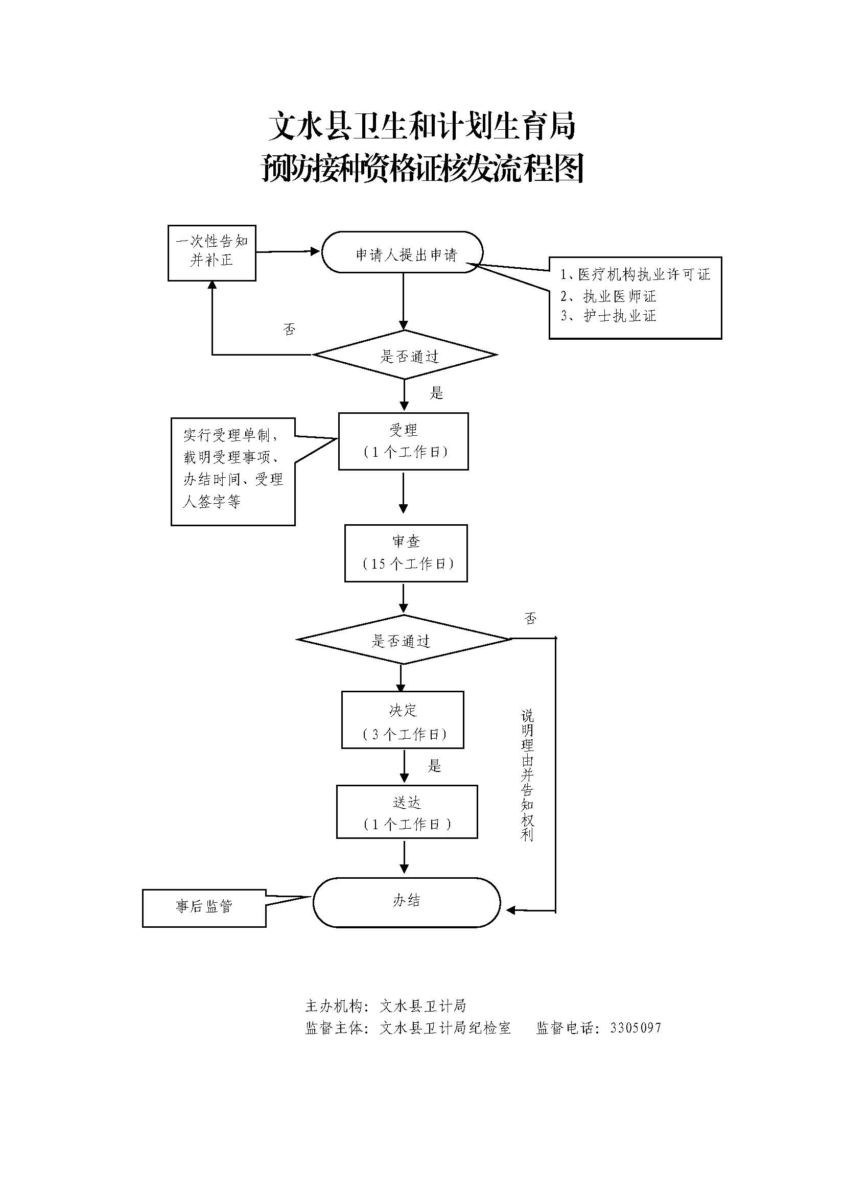 1.受理环节责任:公示预防接种资格证核发依法应当提交的材料和受理条件;一次性告知补齐补正材料;依法受理或不予受理(不予受理应当告知理由)。 |