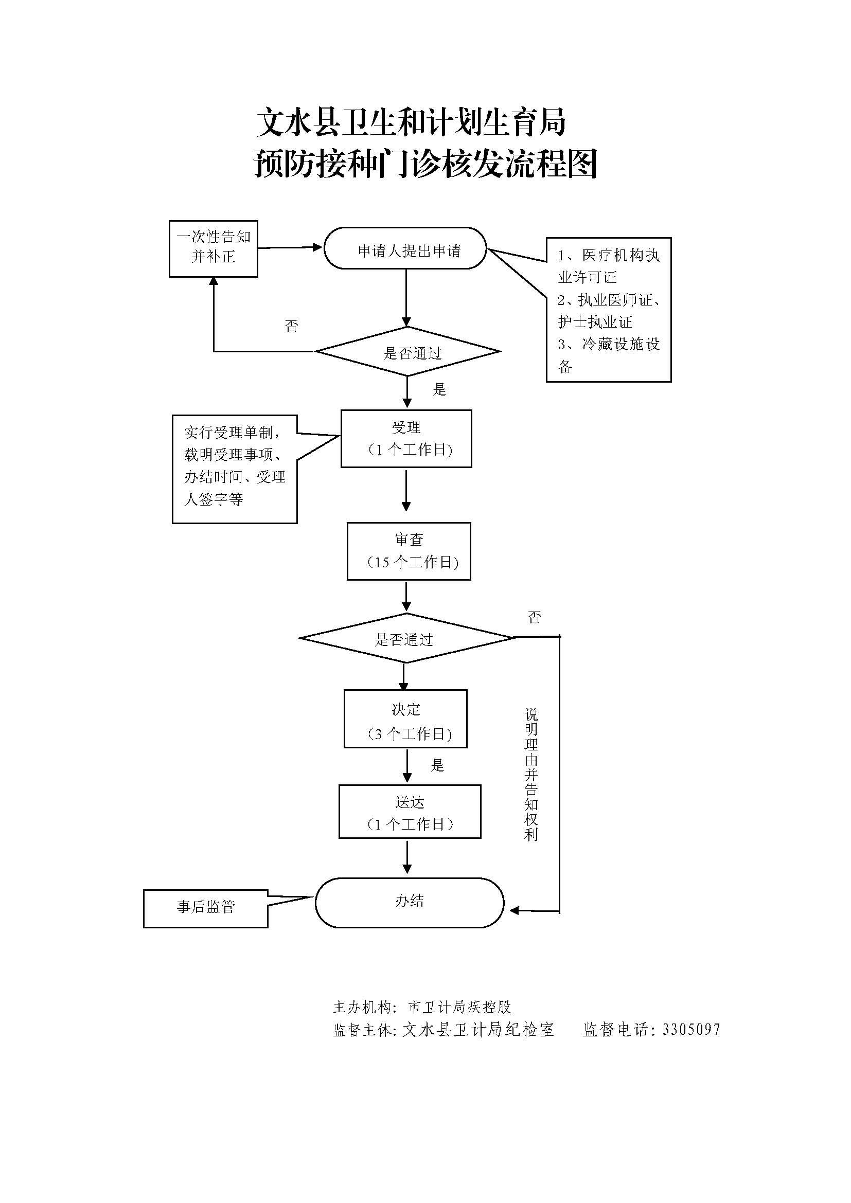 1.受理环节责任:公示预防接种门诊许可证核发依法应当提交的材料和受理条件;一次性告知补齐补正材料;依法受理或不予受理(不予受理应当告知理由)。 |