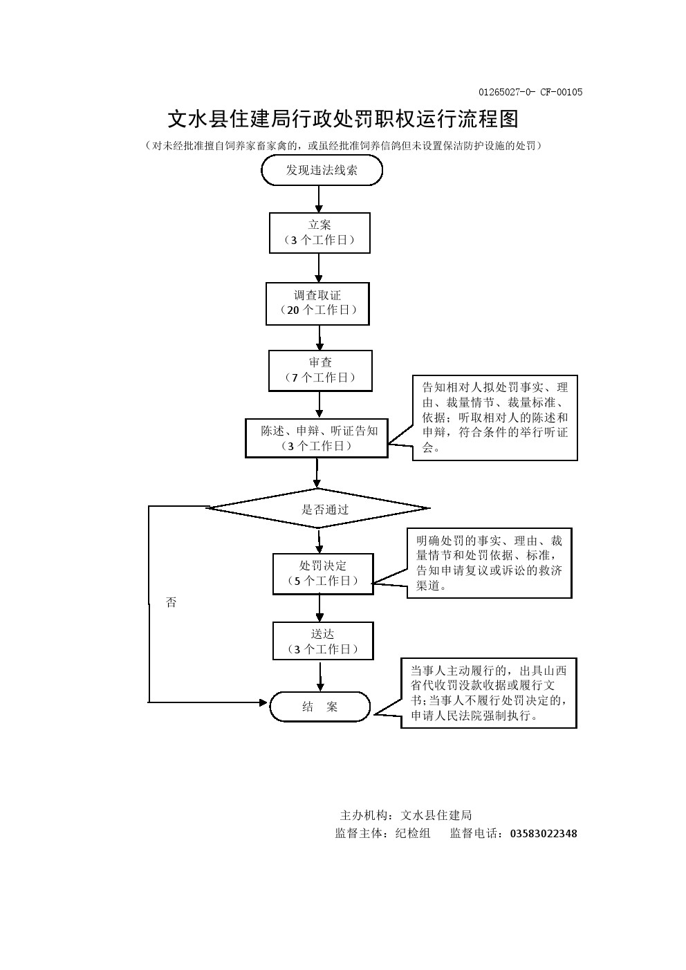 行政处罚 | 01265027-0-CF-0105 | 对未经批准擅自饲养家畜家禽的,或虽经批准饲养信鸽但未设置保洁防护设施的处罚 | 【行政法规】《城市市容和环境卫生管理条例》(国务院令第101号) 第三十五条 | 1、立案责任:日常管理中发现或者接到举报有未经批准擅自饲养家畜家禽的,或虽经批准饲养信鸽但未设置保洁防护设施的,应予以审查,决定是否立案; | 1、对巡查、举报、移送、交办的涉嫌违法的行为不进行现场检查核实的;2、对涉嫌违法的行为不及时立案及时审批的;3、调查取证行为不符合有关规定的;4、收集证据不全面的;5、不按照规定时效进行调查的;6、对应当予以处罚的违法行为不予处罚的;7、没有法律和事实依据实施行政处罚的;8、违反法定的行政处罚程序的;9、随意使用自由裁量权,擅自改变行政处罚种类、幅度、范围的;10、违反“罚缴分离”规定,擅自收取罚款的;11、对当事人进行罚款不使用法定单据的;12、符合听证条件、当事人要求听证,应予组织听证而不组织听证的;13、私分、挪用、截留、非法占用罚款的;14、因处罚不当给当事人造成财产损失等不良后果的;15、在行政处罚过程中滥用职权、玩忽职守、徇私舞弊的;16、在行政处罚过程中发生腐败行为的;17、其他违反法律法规规章文件规定的行为。 | 【法律】《中华人民共和国行政处罚法》第五十五、第五十七至六十二条。《中华人民共和国公务员法》第五十三、五十六、一百零六条。 【行政法规】 《行政机关公务员处分条例》(国务院第495号令) 【规章】《事业单位工作人员处分暂行规定》(人社部、监察部18号令) 【地方性法规】《山西省行政执法条例》第十三条、第四十至四十二条; 【党内法规】《中国共产党纪律处分条例》。 【规范性文件】《山西省行政机关及其工作人员行政过错责任追究暂行办法 》;《吕梁市行政执法责任追究暂行办法》第八条、第二十四条。 | (一)行政处理 1、诫勉谈话或者责令书面检讨; 2、通报批评; 3、暂扣行政执法证件; 4、责令离岗培训; 5、调离执法岗位 6、取消执法资格; 7、依法追偿部分或者全部行政赔偿费用。 (二)行政处分:警告、记过、记大过、降级、撤职、开除。 (三)党纪处分:警告、严重警告、撤销党内职务、留党察看、开除党籍。 (四)其他法律责任 | |