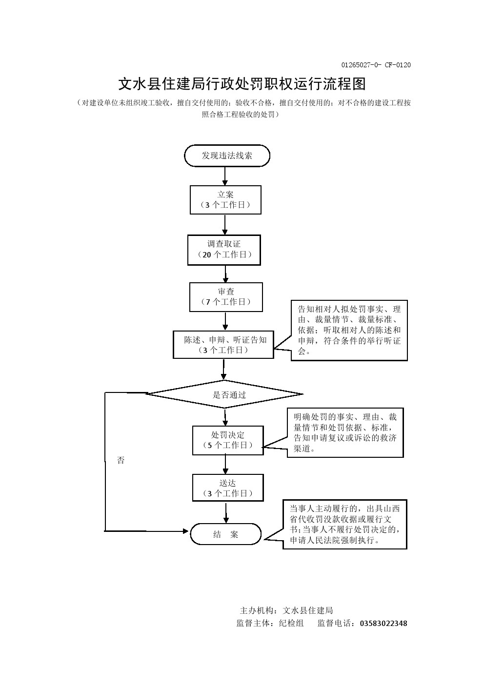 行政处罚 | 01265027-0-CF-0120 | 对建设单位未组织竣工验收,擅自交付使用的;验收不合格,擅自交付使用的;对不合格的建设工程按照合格工程验收的处罚 | 【行政法规】《建设工程质量管理条例》(国务院令第279号)第五十八条 | 1、立案责任:日常管理中发现或者接到举报有违法行为的,应予以审查,决定是否立案; | 1、对执法人员巡查、群众举报、移送、交办的涉嫌违法的行为不进行现场检查核实的; | 【法律】《中华人民共和国行政处罚法》第五十五、第五十七至六十二条。《中华人民共和国公务员法》第五十三、五十六、一百零六条。 【行政法规】 《行政机关公务员处分条例》(国务院第495号令) 【规章】《事业单位工作人员处分暂行规定》(人社部、监察部18号令) 【地方性法规】《山西省行政执法条例》第十三条、第四十至四十二条; 【党内法规】《中国共产党纪律处分条例》。 【规范性文件】《山西省行政机关及其工作人员行政过错责任追究暂行办法 》;《吕梁市行政执法责任追究暂行办法》第八条、第二十四条。 | (一)行政处理 1、诫勉谈话或者责令书面检讨; 2、通报批评; 3、暂扣行政执法证件; 4、责令离岗培训; 5、调离执法岗位 6、取消执法资格; 7、依法追偿部分或者全部行政赔偿费用。 (二)行政处分:警告、记过、记大过、降级、撤职、开除。 (三)党纪处分:警告、严重警告、撤销党内职务、留党察看、开除党籍。 (四)其他法律责任 | |