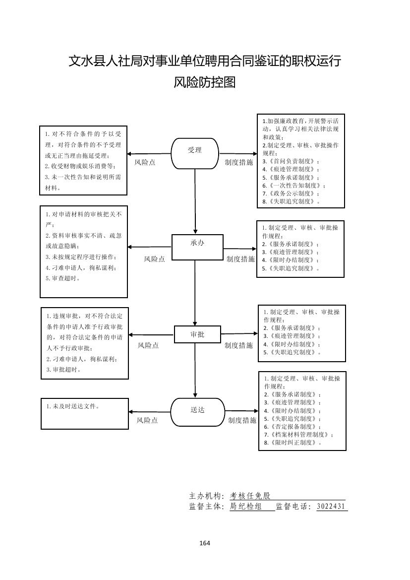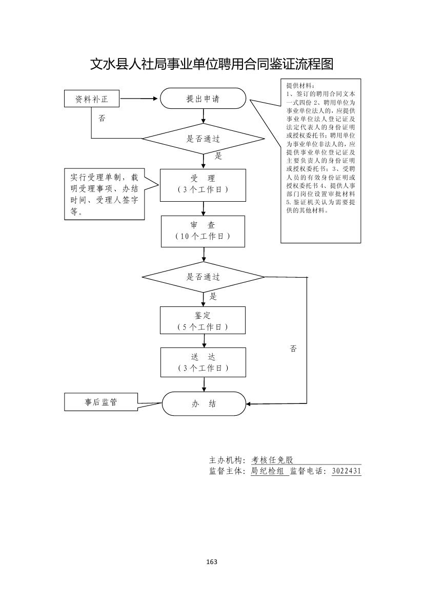 1.受理责任:告知事业单位聘用合同鉴证应当提交的材料,一次性告知补正材料,依法受理或不予受理(不予受理应当告知理由)。 2.鉴证责任:对所签订合同做出鉴证,是否正确填写与所报材料一致。 3.其他法律法规规章文件规定应履行的责任。 |