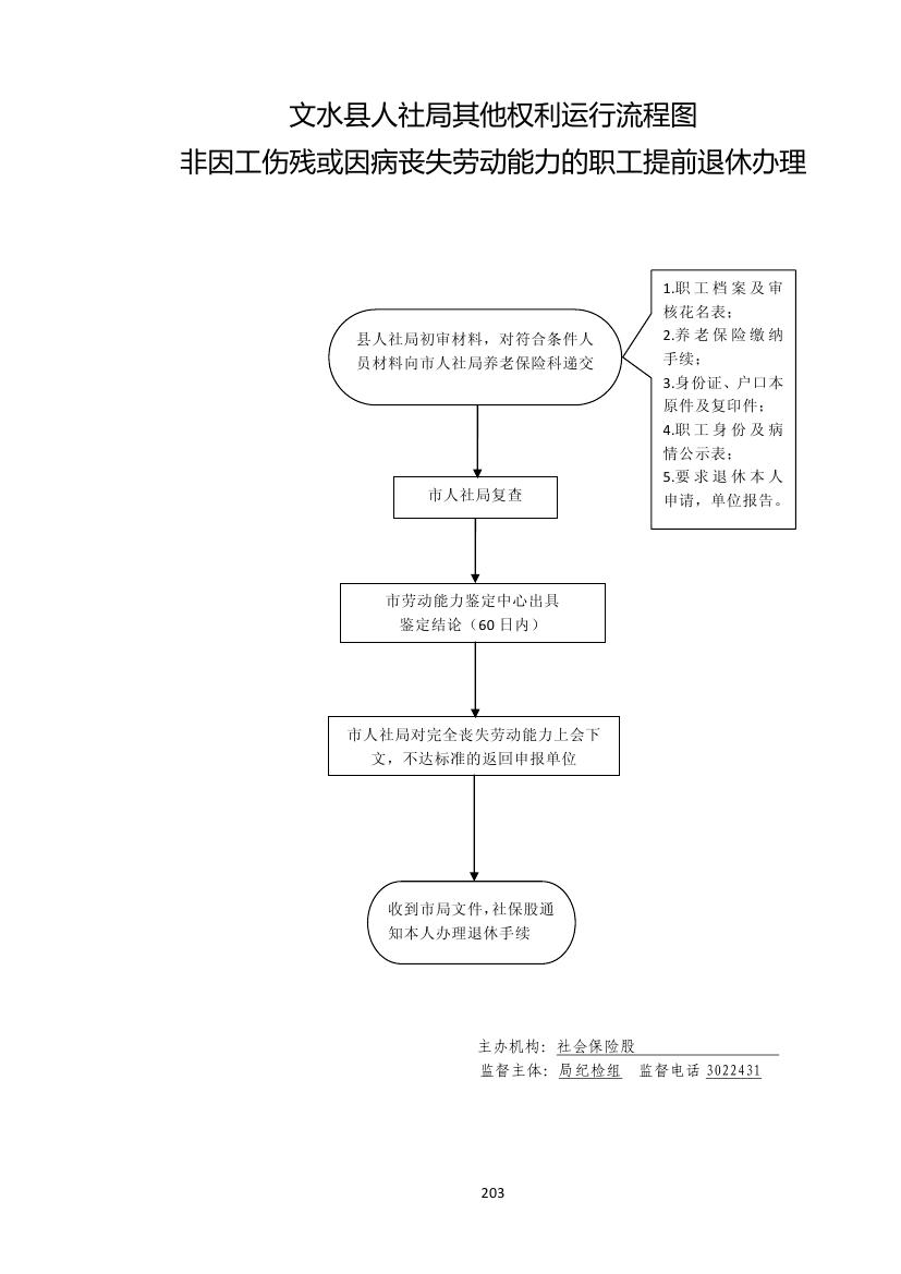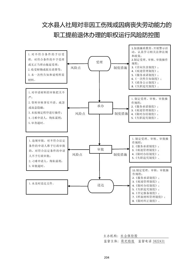 1.受理阶段责任:符合非因工伤残或因病丧失劳动能力的职工提前退休办理条 件的予以受理,对不符合 条件的不予受理(材料不 全的,一次性告知所需材 料) 2.承办阶段责任:按规定 程序进行操作,对申报的 材料严格把关。 3.审批阶段责任:对符合 法定条件的申请人严格按 照政策办理。 4.送达阶段责任:及时送 达有关文件。 |