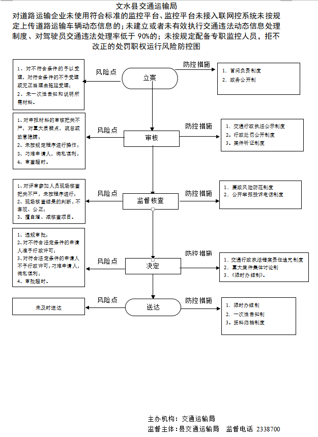 1、立案责任:公示应当提交的材料,一次性告知补正材料,依法受理或不予受理(不予受理应当告知理由)。 2、审查责任:对书面申请材料进行审查,提出审核意见,对竣工验收工程要组织现场检查验收。 3、决定责任;作出行政许可或者不予行政许可决定,竣工验收要做出结论,法定告知(不予许可的应当书面告知理由)。 4、送达责任:准予许可的制发送达许可证,按规定信息公开。 5、监管责任:建立实施监督检查的运行机制和管理制度,开展定期和不定期检查,依法采取相关处置措施。 6、其他法律法规规章文件规定应履行的责任。 |