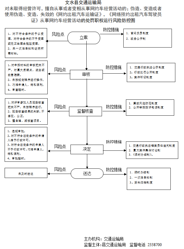 1、立案责任:公示应当提交的材料,一次性告知补正材料,依法受理或不予受理(不予受理应当告知理由)。 2、审查责任:对书面申请材料进行审查,提出审核意见,对竣工验收工程要组织现场检查验收。 3、决定责任;作出行政许可或者不予行政许可决定,竣工验收要做出结论,法定告知(不予许可的应当书面告知理由)。 4、送达责任:准予许可的制发送达许可证,按规定信息公开。 5、监管责任:建立实施监督检查的运行机制和管理制度,开展定期和不定期检查,依法采取相关处置措施。 6、其他法律法规规章文件规定应履行的责任。 |