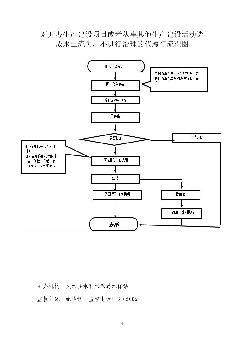 行政强制 | 01265058-8-QZ-0005 | 对开办生产建设项目或者从事其他生产建设活动造成水土流失,不进行治理的代履行 | 【法律】《中华人民共和国水土保持法》第五十六条 | 1、受理责任:行政机关依法作出要求当事人履行排除妨碍、恢复原状等义务的行政决定,当事人逾期不履行,向行政机构负责人报批同意,启动代执行程序; | 1、代履行不得采用暴力、胁迫以及其他非法方式; | 【法律】《中华人民共和国水土保持法》第四十七条;《行政强制法》第六十一条至第六十四条;《中华人民共和国公务员法》第五十三、五十六、一百零六条。 《中华人民共和国水法》第七十五条。 【行政法规】 《行政机关公务员处分条例》(国务院第495号令) 【地方性法规】《山西省行政执法条例》第十三条、第四十至四十二条; 【党内法规】《中国共产党纪律处分条例》。 【规范性文件】《山西省行政机关及其工作人员行政过错责任追究暂行办法 》;《吕梁市行政执法责任追究暂行办法》第九条、第二十四条