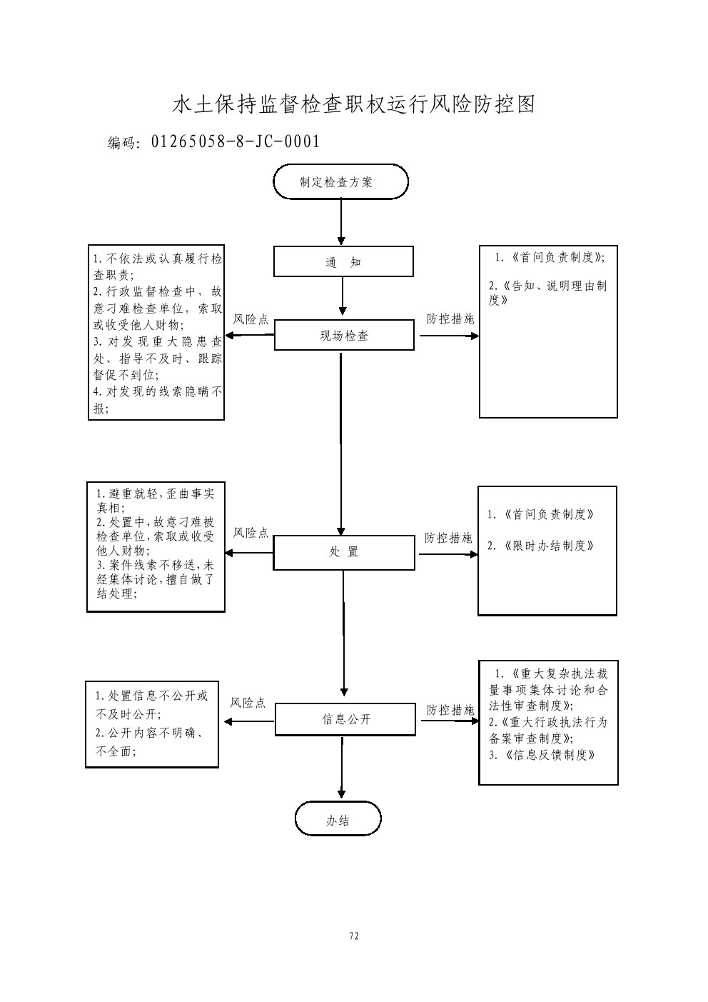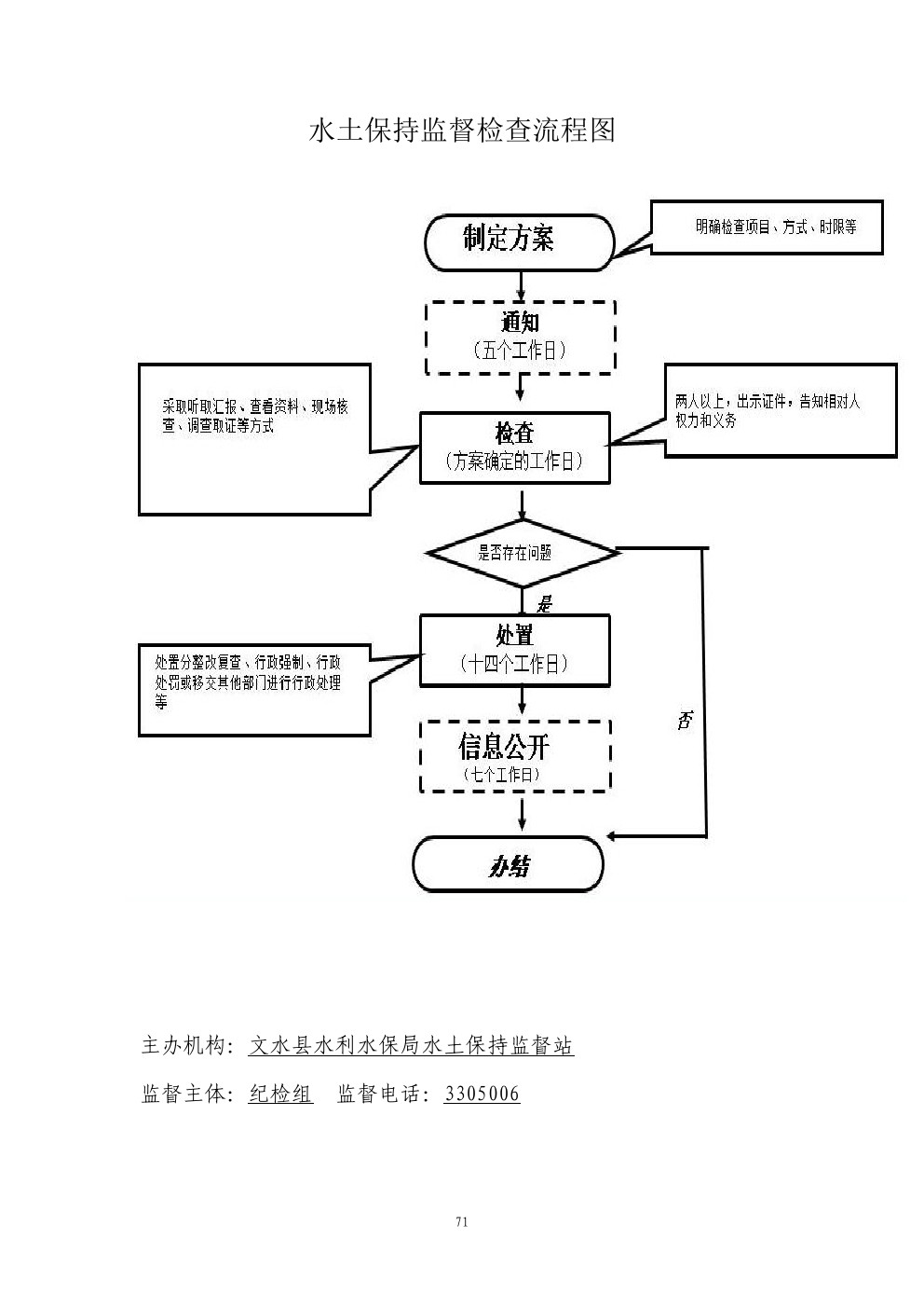 1、制定通知责任:出台检查文件或方案;并在规定时间内将文件或方案通知有关单; 2、检查责任:执法人员出示执法证件;对照批复的水土保持方案进行现场检查,并召开座谈会; 6、其他法律法规规章文件规定应履行的责任。 |