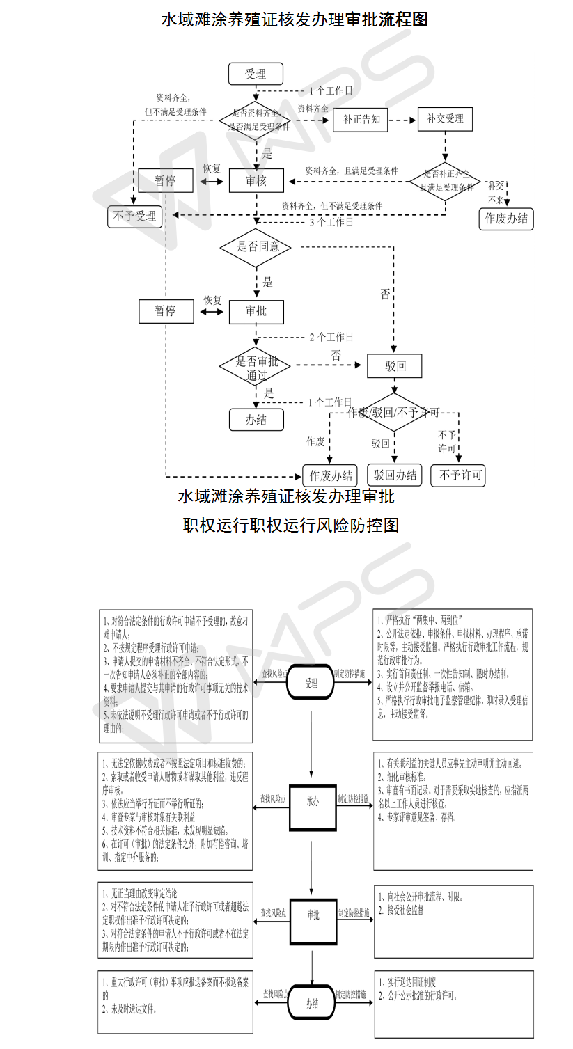 1、受理责任:公示水域滩涂养殖证核发审批应当提交的材料,一次性告知补正材料,依法受理或不予受理,不予受理的应当书面告知; 5、事后监管责任:建立实施监督检查的运行机制和管理制度,开展定期和不定期检查,依法采取相关处置措施。 6.其他责任:法律法规规章规定应履行的责任。 |