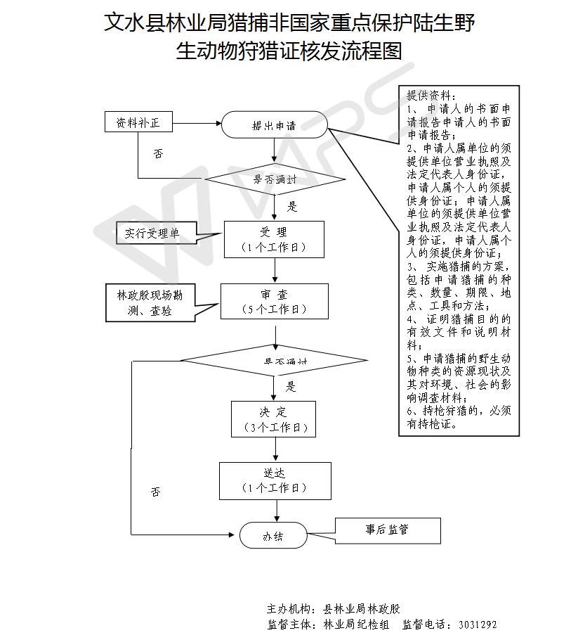 1、受理责任:公示狩猎证核发应当提交的材料,一次性告知补正材料,依法受理或不予受理(不予受理应当告知理由)。 |