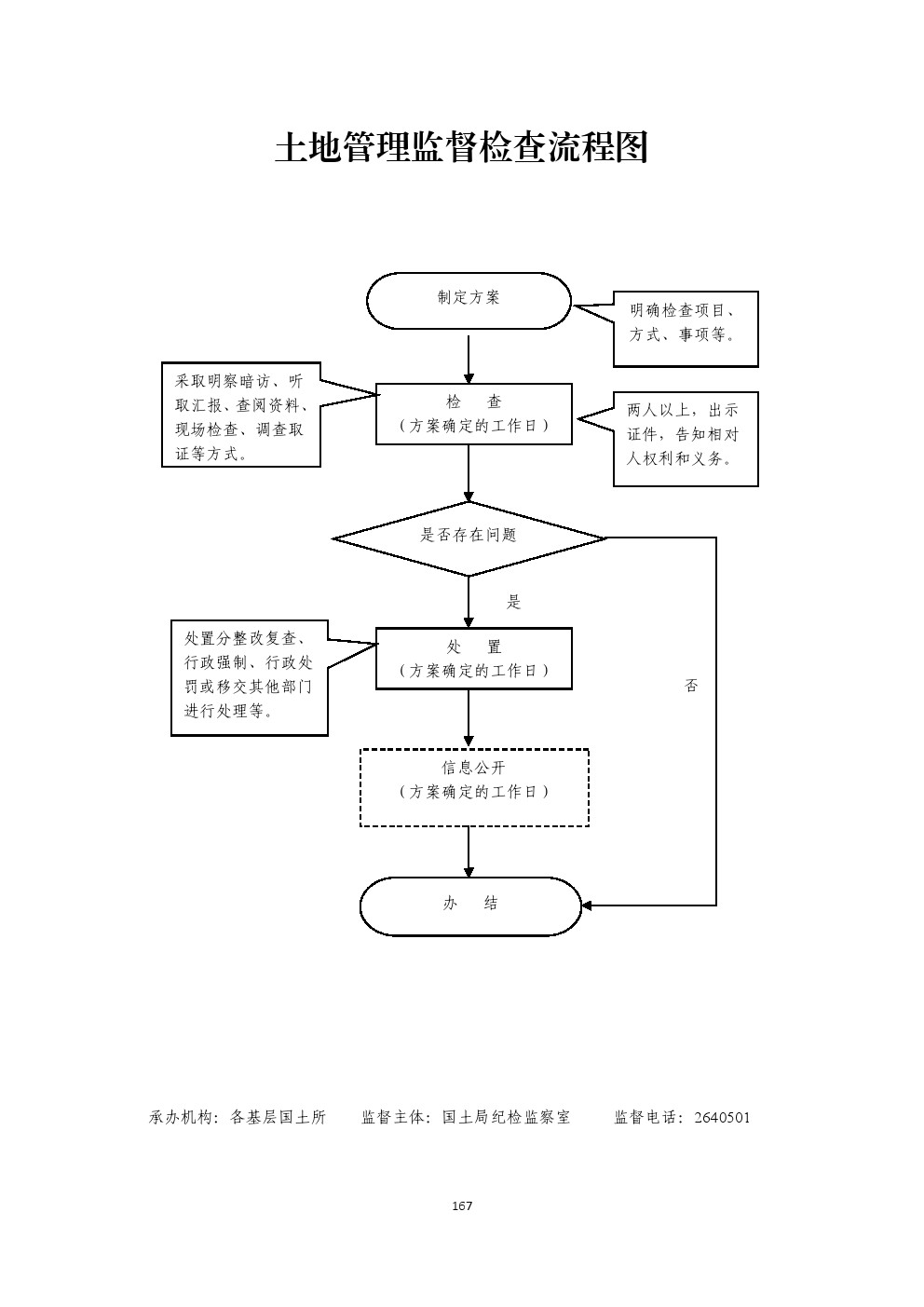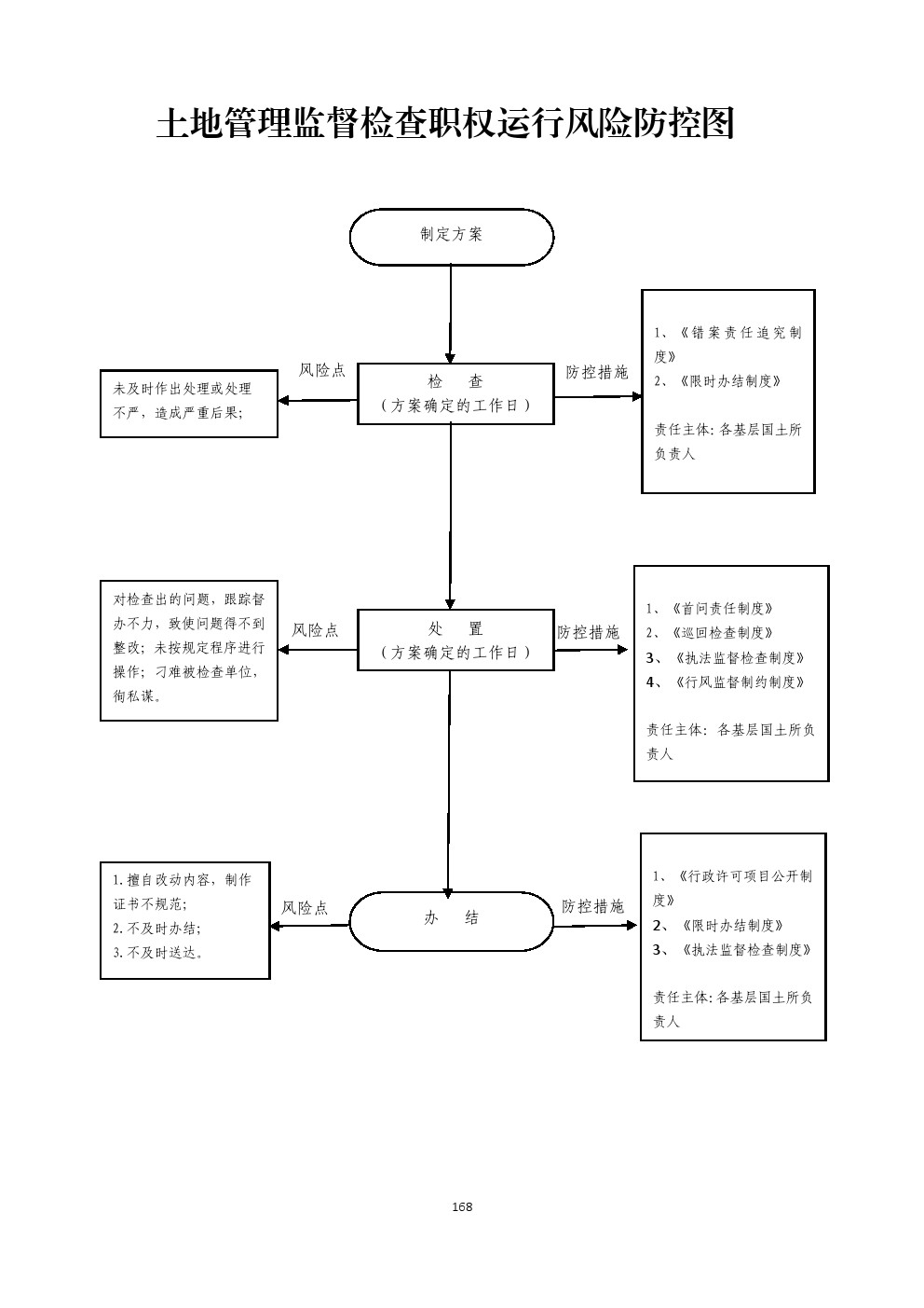 行政 检查 | 01265026-2-JC-0004 | 土地管理监督检 查 | 【法律】《中华人民共和国土地管理法》第六十六条、第六十七条; 【行政法规】《中华人民共和国土地管理法实施条例》(国务院令第256号)第三十二条。 | 1.检查责任:土地行政主管部门组织开展检查工作,制定检查方案,采取明查暗访、听取汇报、查阅资料、现场检查调查取证等方式. 2.处置责任:处置分整改复查、行政强制、行政处罚或移交其他部门进行处理等。 3.信息公开责任:检查结束后,向被检查对象书面反馈意见,并依规对检查情况进行公开。 | 1.未按规定进行监督检查; 2.对符合条件的投诉举报人作出不予受理或不在法定期限内作出受理的决定; 3.不依法履行检查职责或检查不力导致国家或个人利益受到损害的; 4.检查中索取或收受他人财物或者谋取其他利益的; 5.其他违反法律法规规章文件的行为。 | 【法律】《中华人民共和国土地管理法》第八十四条;《公务员法》第五十三、五十四、五十五条; 【行政法规】《行政机关公务员处分条例》(国务院第495号令); 【部门规章】《事业单位工作人员处分暂行规定》(人社部、监察部18号令); 【地方性法规】《山西省行政执法条例》第十三条、第四十至四十二条; 【党内法规】《中国共产党纪律处分条例》; 【规范性文件】《山西省行政机关及其工作人员行政过错责任追究暂行办法 》;《吕梁市行政执法责任追究暂行办法》第十五条、二十四条。 | (一)行政处理 1、诫勉谈话或者责令书面检讨; 2、通报批评; 3、暂扣行政执法证件; 4、责令离岗培训; 5、调离执法岗位 6、取消执法资格; 7、依法追偿部分或者全部行政赔偿费用。 (二)行政处分:警告、记过、记大过、降级、撤职、开除。 (三)党纪处分:警告、严重警告、撤销党内职务、留党察看、开除党籍。 (四)其他法律责任。 | |