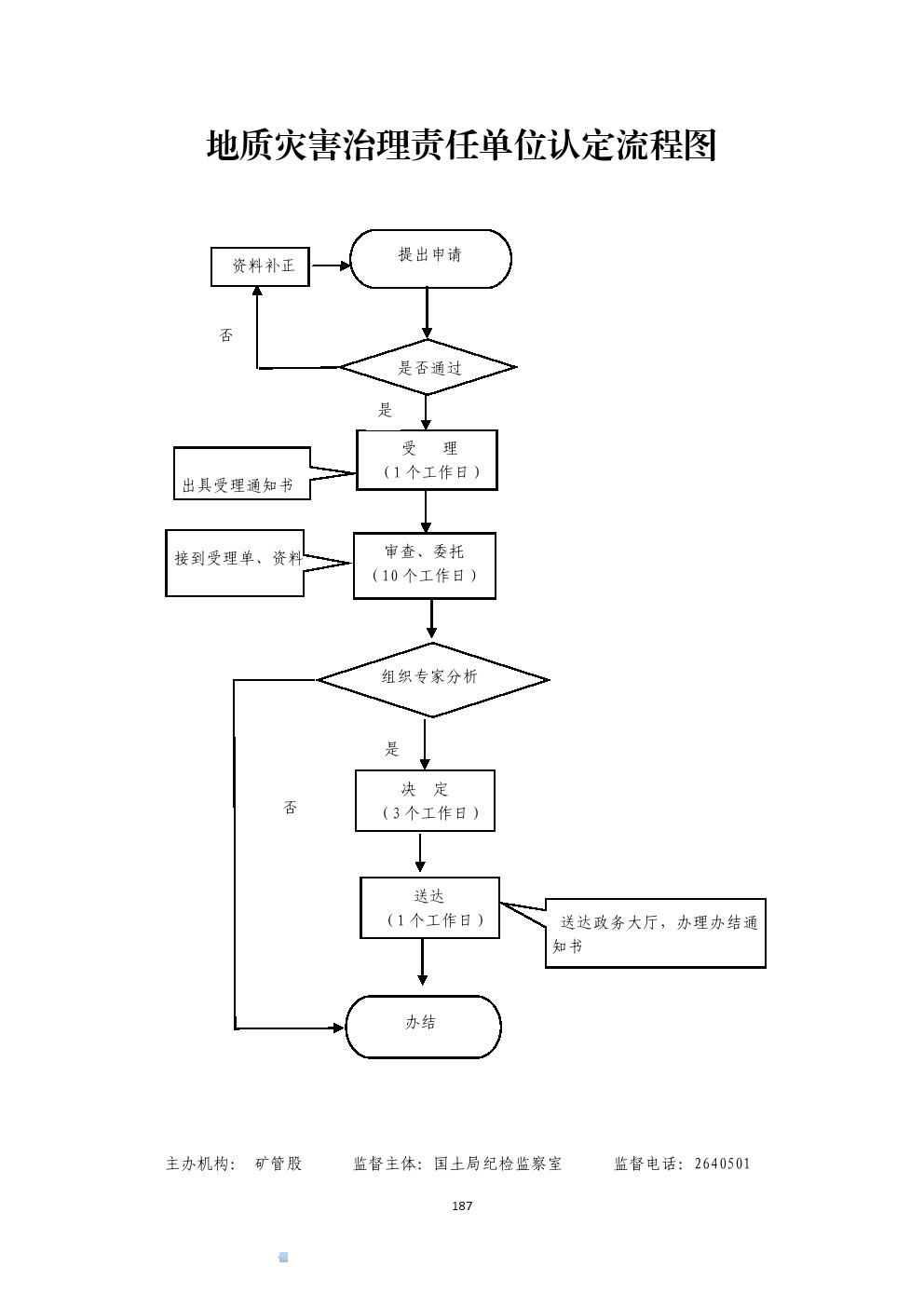 1、公示应当提交的材料,一次告知补正材料、依法受理或者不予受理(不予受理应告知理由) 2、对申请人提交的申请材料进行审查核实。 3、向吕梁市国土资源局上报。 4、建立实施监督检查的运行机制和管理制度。 5、其他法律法规规章规定应履行的责任 |